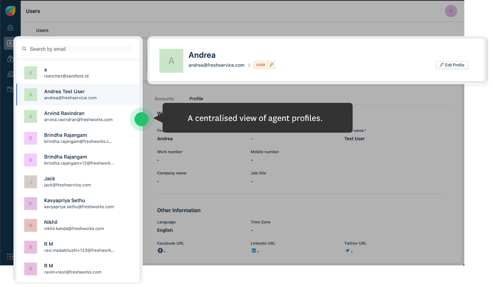 Um perfil centralizado: os agentes podem atualizar seu nome, sobrenome, cargo, telefone comercial, celular e foto de perfil de seu perfil do Freshworks. A imagem daqui será usada em seu perfil em todos os produtos Freshworks da organização. Os agentes precisarão modificar alguns outros atributos de perfil, como idioma, fuso horário, assinatura, etc. de seu perfil do Freshdesk.