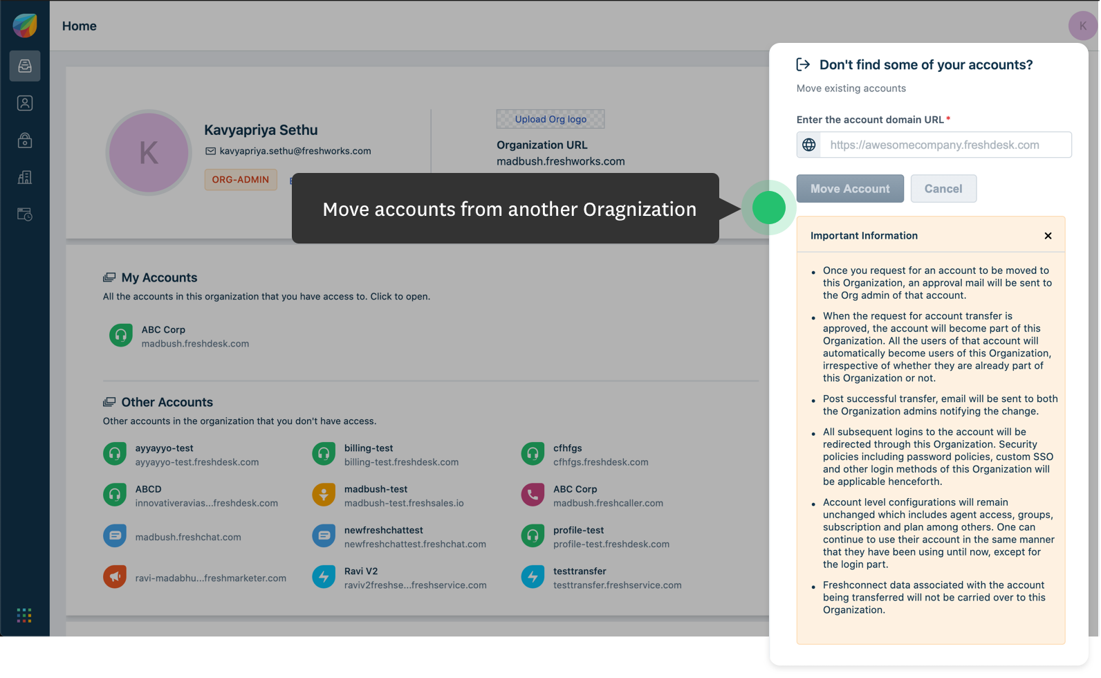 - Os administradores de contas do Freshdesk não serão convertidos automaticamente em administradores da organização. Eles devem receber privilégios de um administrador da organização existente.