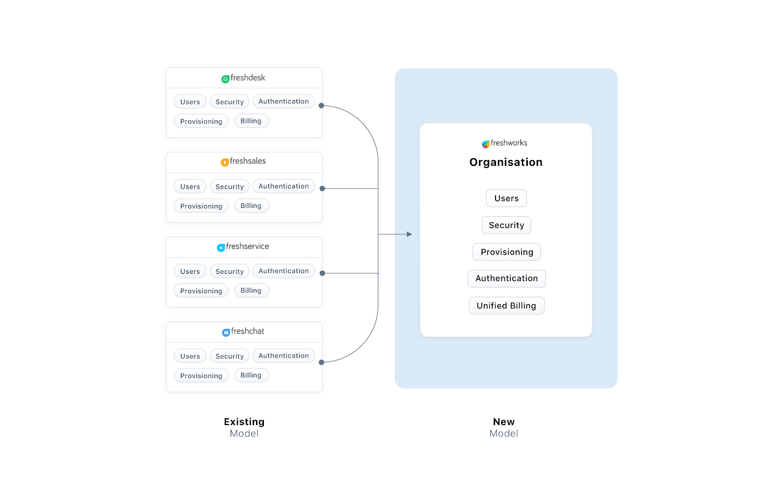 Após a migração, certifique-se de que todas as suas contas de produtos Freshworks sejam mapeadas para sua organização central.