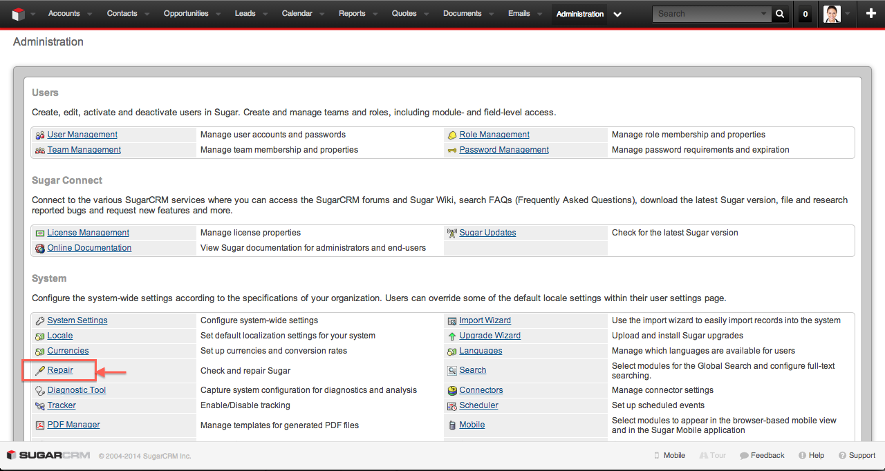 - Volte para as configurações de administrador. Verifique e repare o módulo. (Observação: esta etapa é muito importante. Se isso não for feito, o painel não aparecerá, pois limpará o cache do painel dentro do SugarCRM ao carregar o arquivo zip)