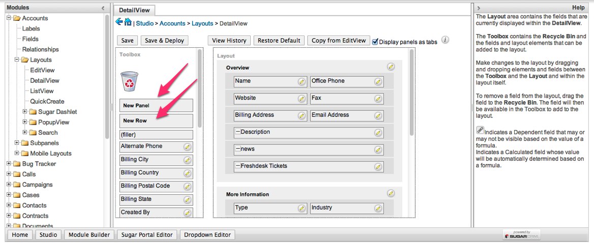 - Clique em Contas> Layouts> Visualização detalhada (você seguirá as mesmas instruções para CONTATOS, LEADS E CONTAS).