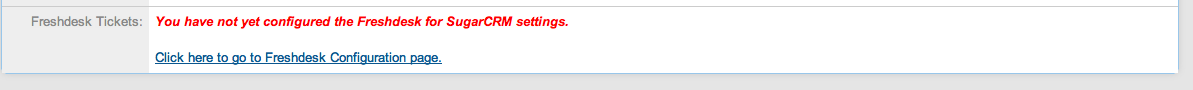 - Depois de fazer isso, vá para a página de detalhes de um lead, contato ou conta específica. Quando estiver configurando a integração pela primeira vez, isso é o que você verá. Clique no link Clique aqui para ir para a página de configuração do Freshdesk . (Esta é uma etapa única e não precisa ser repetida para leads e contatos).