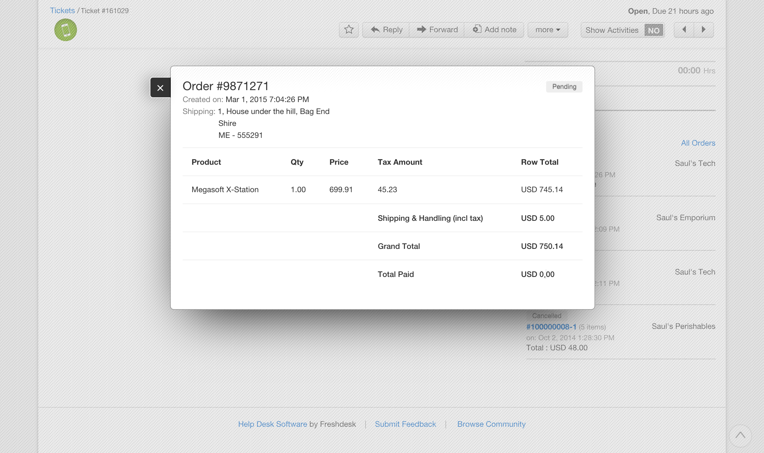 O aplicativo Magento para Freshdesk permite que você acesse as informações do cliente facilmente de sua conta Magento - como endereços de envio, faturas e informações de pedido - em seu helpdesk ao lado de seus bilhetes. Esses detalhes estarão visíveis como parte da visualização de detalhes do tíquete.