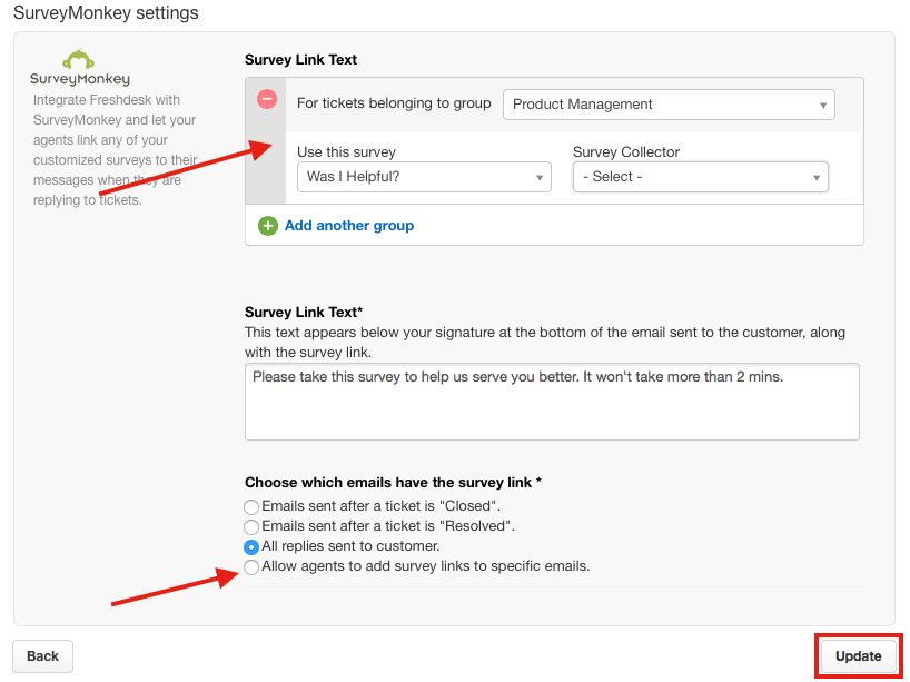 Clique em Atualizar . Essas configurações podem ser editadas a qualquer momento clicando no botão editar na guia SurveyMonkey.