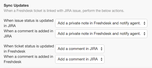 Você pode sincronizar propriedades no Freshdesk e Jira de maneiras diferentes, dependendo do fluxo de trabalho de sua equipe.