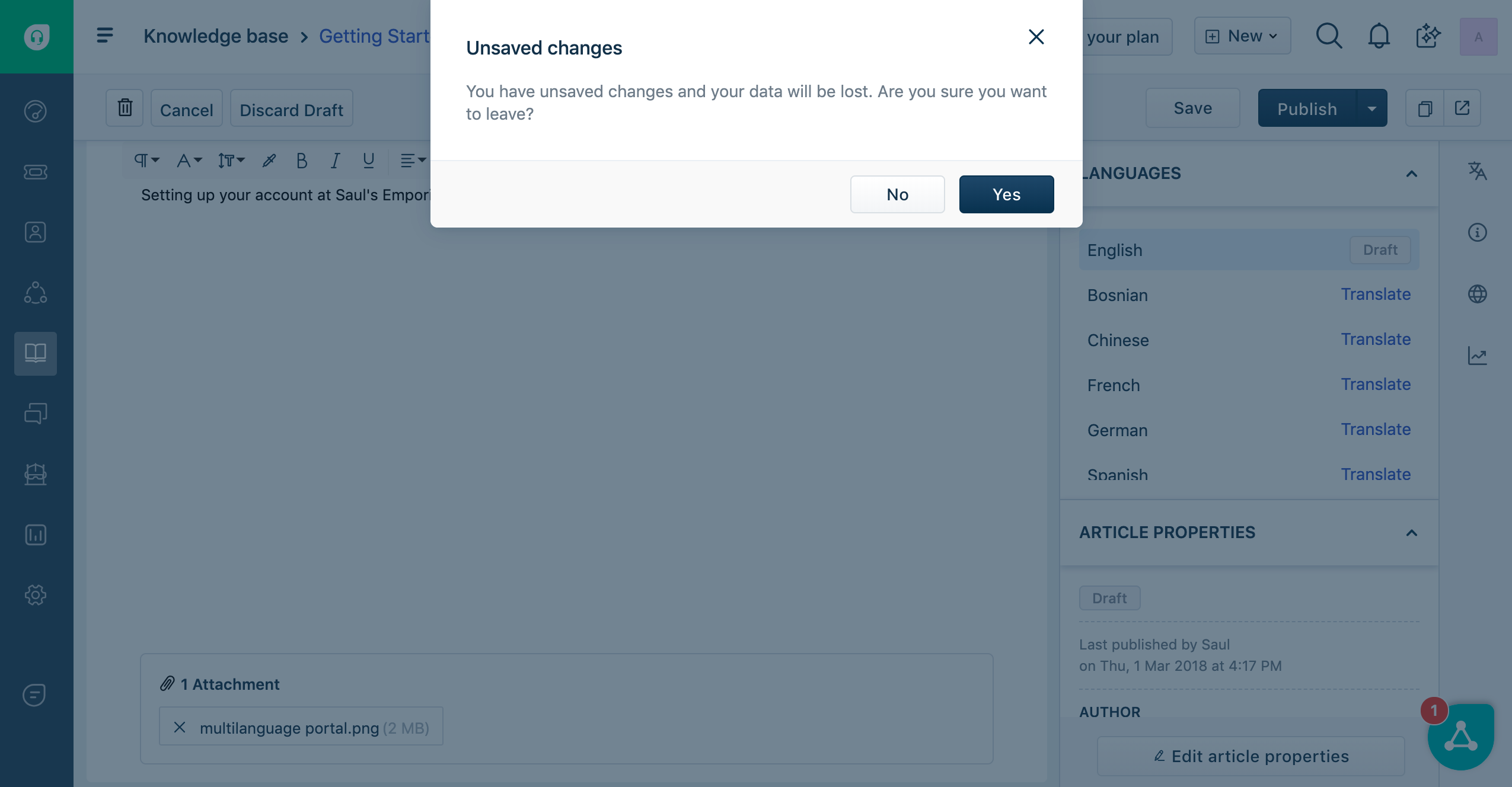 Todos os arquivos que você decidir anexar aos artigos não serão salvos automaticamente. No entanto, um alerta será disparado quando o agente tentar navegar para outras páginas sem clicar em Salvar após adicionar / excluir um anexo.