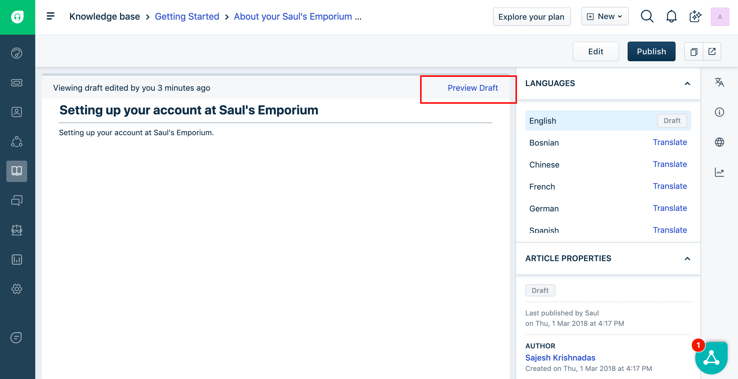 Quando você está editando um artigo e seu colega tenta editar o mesmo artigo, o recurso Colisão de agente entra em ação e evita que a segunda pessoa edite o artigo. No entanto, o segundo agente ainda será capaz de visualizar o artigo clicando na opção Visualizar rascunho acima do artigo, o que permite que os agentes vejam a última versão salva desse artigo e fornece uma visão do que o cliente obtém Vejo.