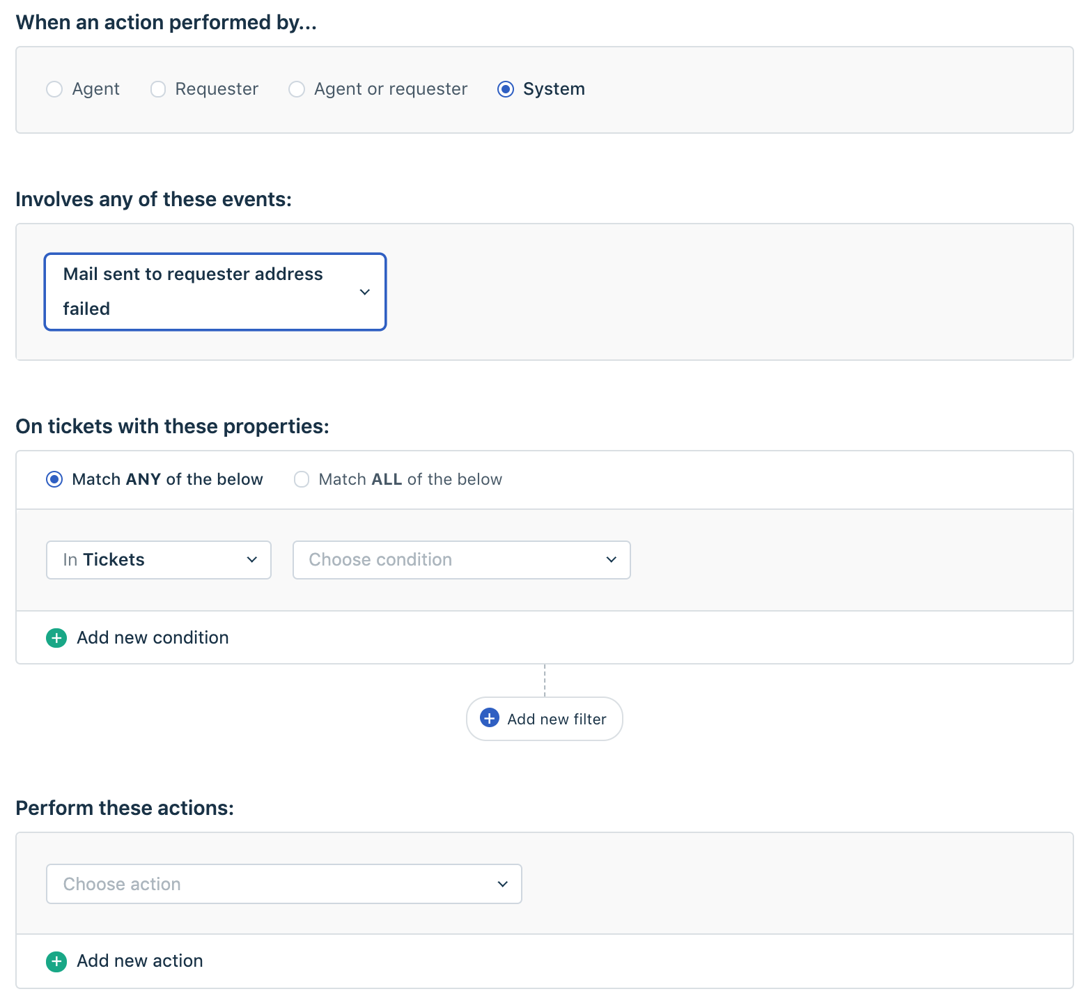 Embora as falhas de entrega de e-mail para endereços de destinatários válidos sejam raras, a ocorrência delas pode afetar as conversas que você tem com seus clientes. Para garantir que sua equipe reaja da melhor maneira possível, você pode usar os eventos de falha de entrega nas regras de automação para acionar ações de acompanhamento nesses tickets imediatamente. Por exemplo, você pode alterar o status do tíquete para abrir ou enviar um e-mail ao supervisor do grupo sempre que isso acontecer.
