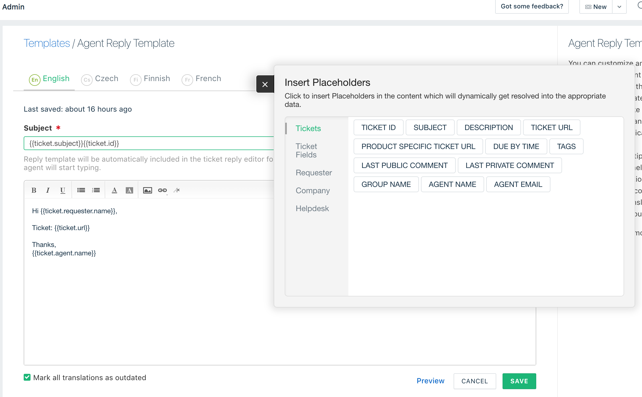 - Adicione o espaço reservado {{ticket.id}} (clicando no botão Inserir espaço reservado) se quiser que todas as suas respostas contenham o ID do tíquete em suas linhas de assunto.