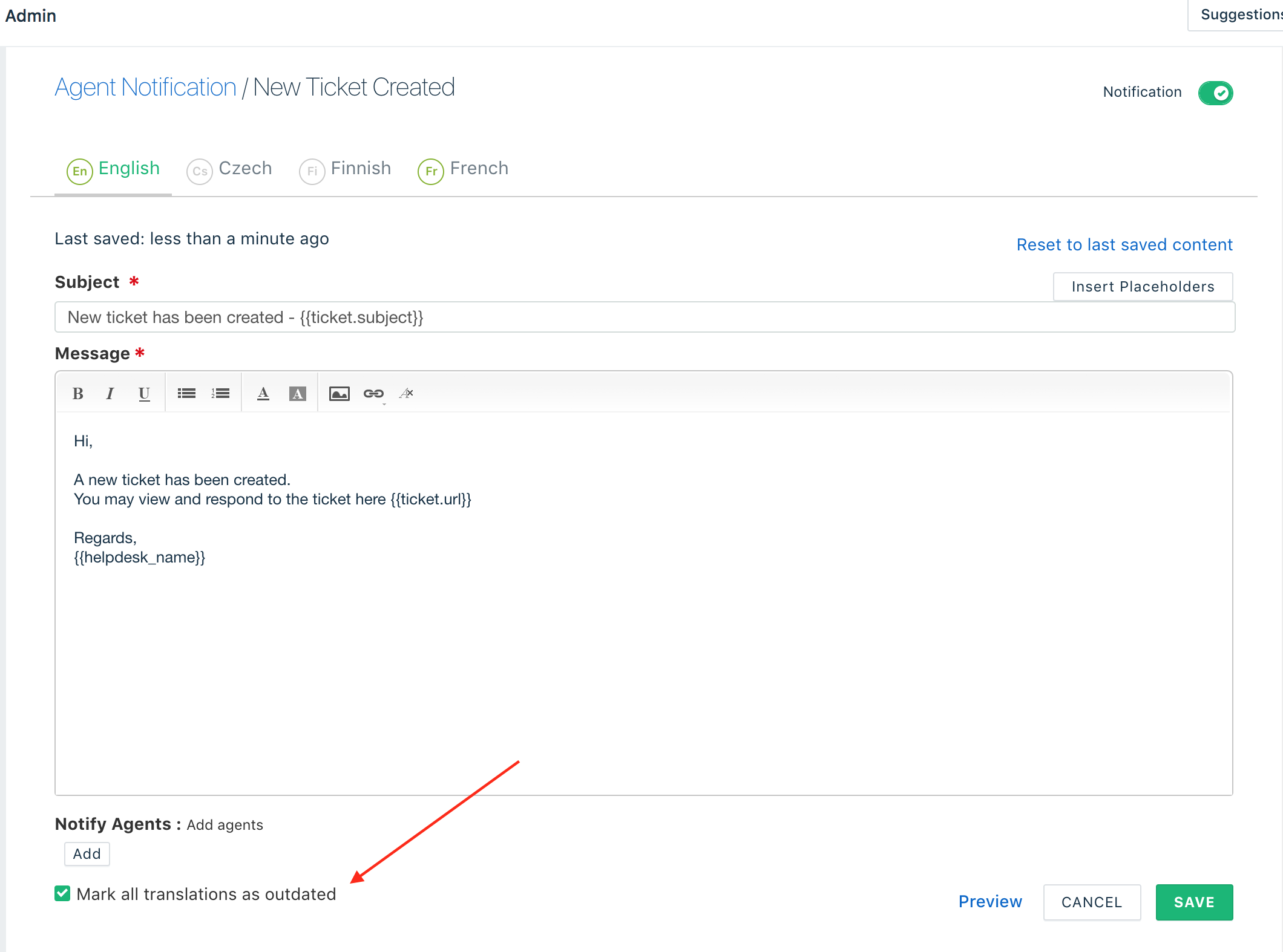 - Depois de editar a notificação específica do idioma, você pode clicar na caixa de seleção que diz Marcar esta tradução como atualizada .