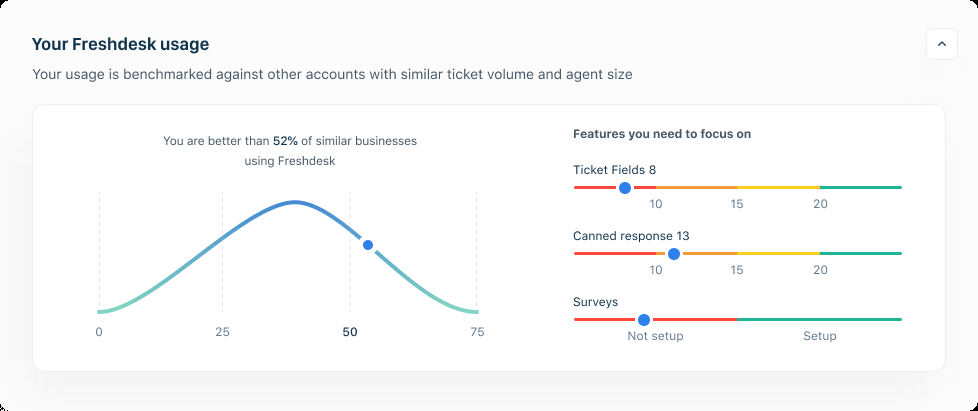 - A classificação é baseada em uma pontuação geral atribuída à sua conta do Freshdesk com base em quão bem você usou os principais recursos do Freshdesk (como artigos da base de conhecimento, resposta predeterminada etc.)