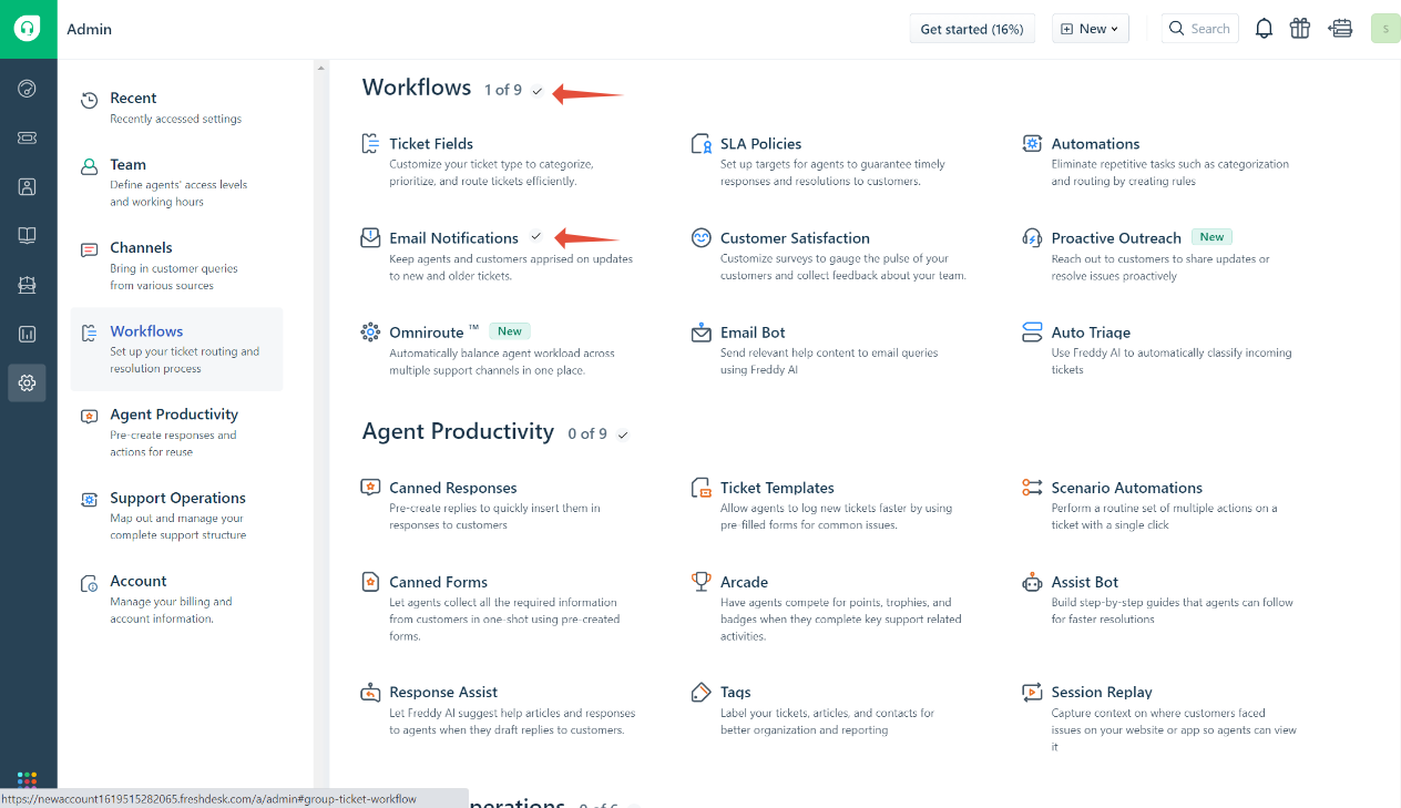 Na imagem mostrada abaixo, você notará que as notificações por e-mail são o único recurso configurado na categoria Workflows . O contador ao lado de Fluxos de trabalho também mostra que 1 de 9 recursos foi configurado nessa categoria.
