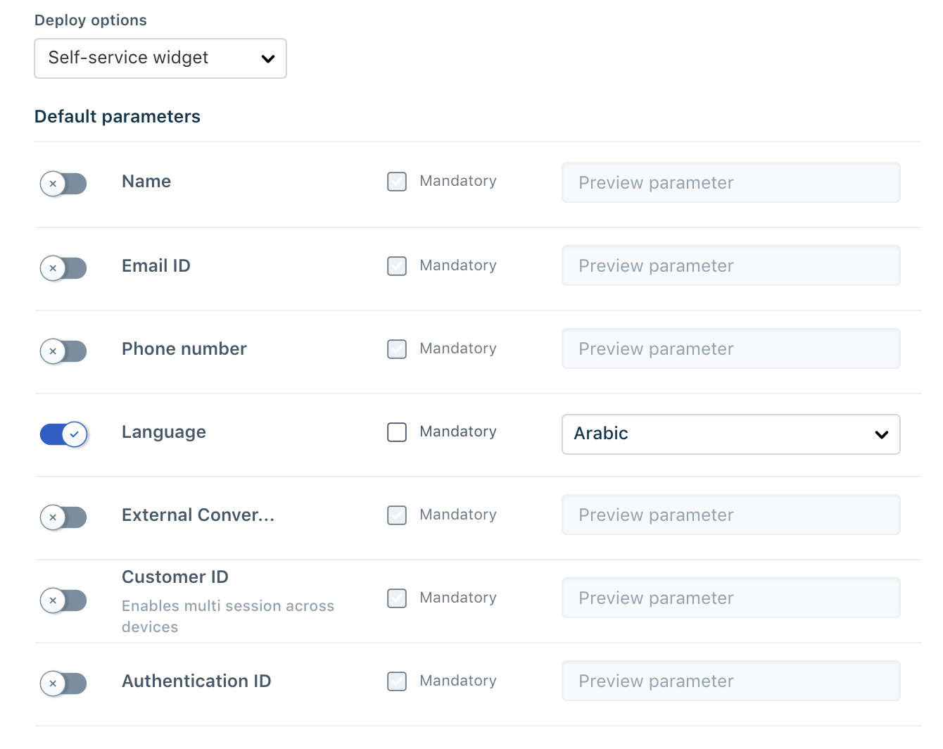 - Ao configurar o widget de autoatendimento, você pode ativar o parâmetro padrão para o idioma. Isso incluirá o parâmetro "cstmr :: lng" no script que é gerado. Você pode pré-preenchê-lo com o idioma que você precisa que o bot carregue.
