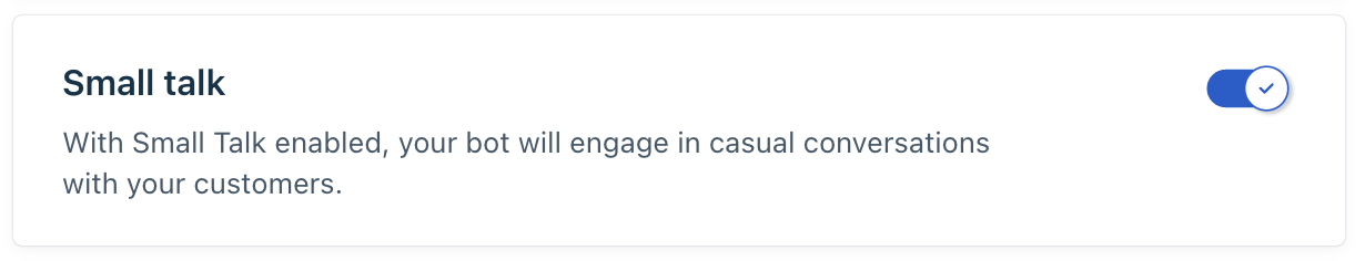 Quando você ativa esse botão, seu bot conversa com seus clientes, oferecendo a eles uma experiência de bot mais humanizada, em vez de um tipo de interação direta de perguntas e respostas. Você pode optar por usar o Small Talk para fazer com que seus bots pareçam mais amigáveis e semelhantes aos humanos.