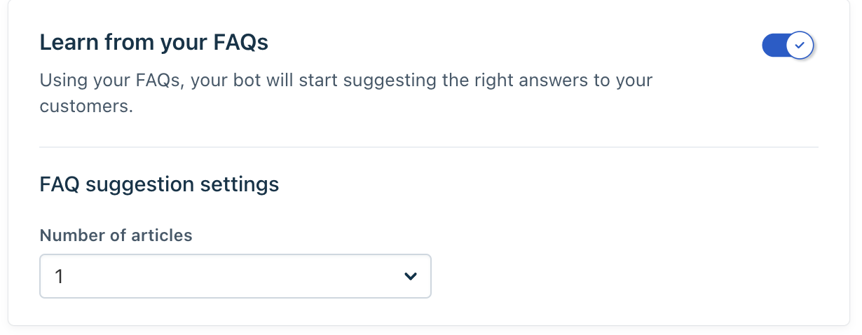 Quando você ativa essa opção, seus bots usam as perguntas frequentes do Freshchat para oferecer respostas mais relevantes às perguntas de seus clientes. Quando um cliente faz uma pergunta, o bot procura respostas que correspondam à intenção das perguntas do cliente. Se uma resposta adequada não estiver disponível, o bot compartilhará o conteúdo das perguntas frequentes.