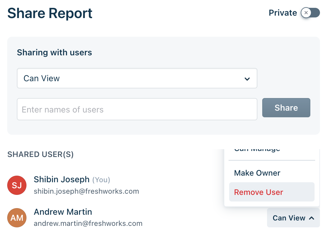 Revogar o acesso a todos os usuários: a alternância Privado é desativada quando um relatório é compartilhado com os usuários. Você pode ativar esta alternância para revogar o acesso a todos os usuários de uma só vez. A opção de permissões para cada usuário ficará esmaecida com a opção Privado ativada.