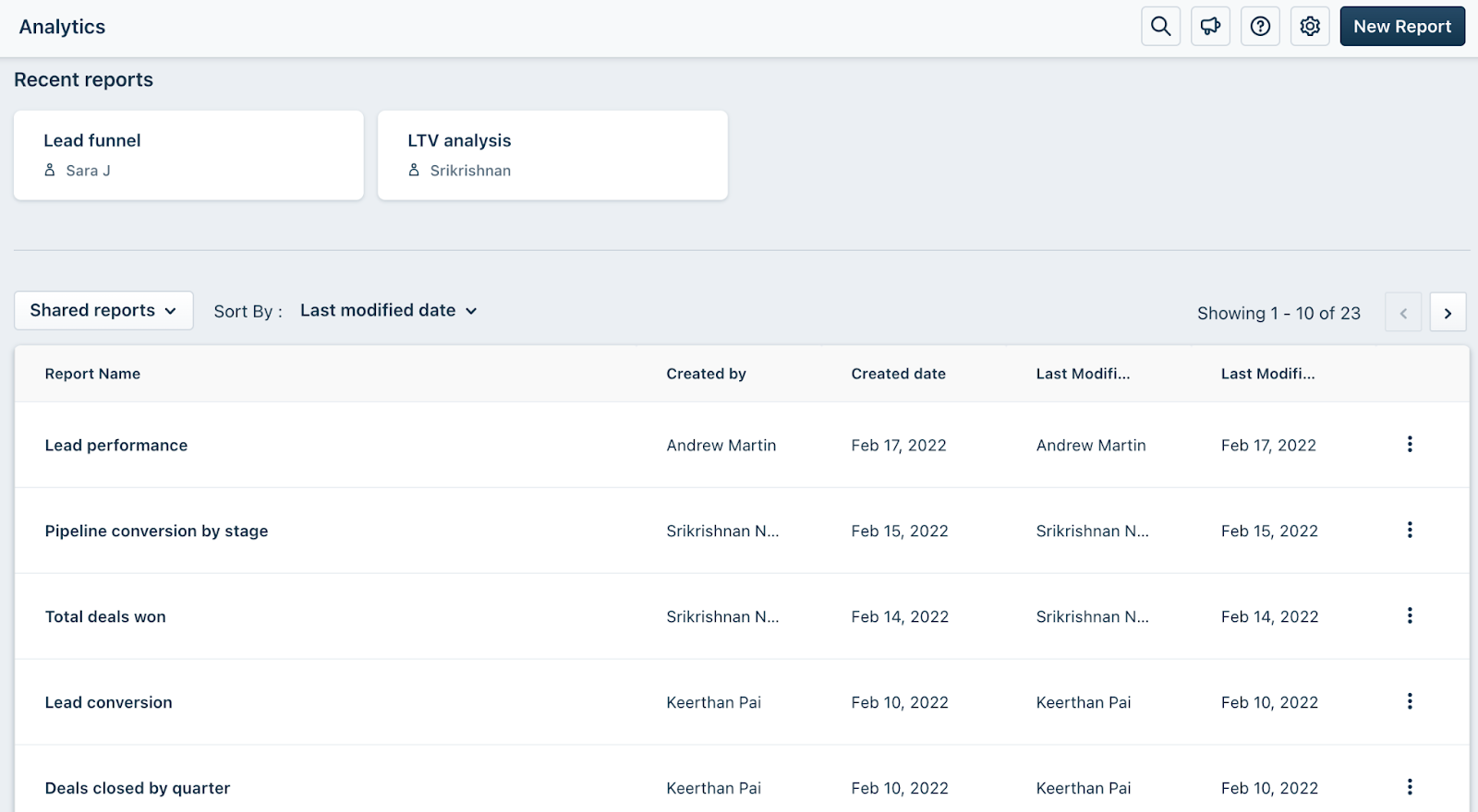 Você pode ver os relatórios que outros usuários compartilharam com você na seção "Relatórios compartilhados" na página inicial de Relatórios. Você pode classificar relatórios em ordem crescente ou decrescente com base em Nome, Criado por, Data de criação, Última modificação por ou Data da última modificação.