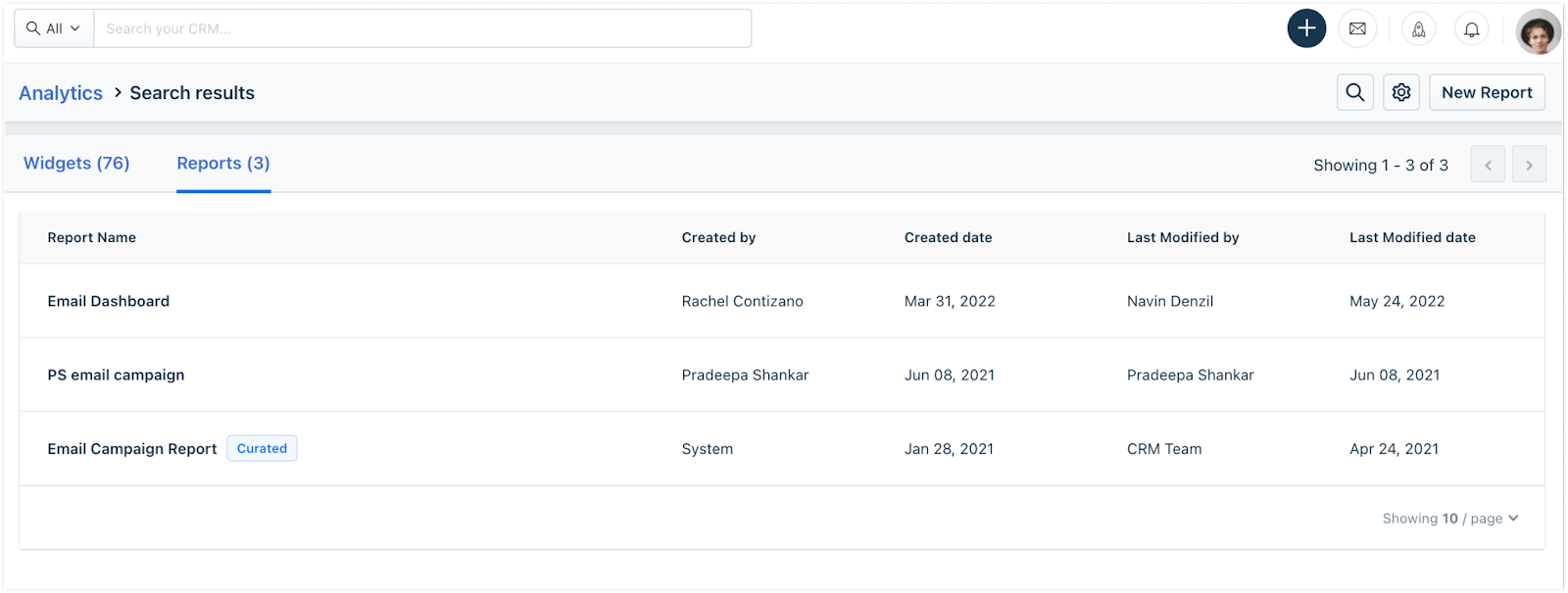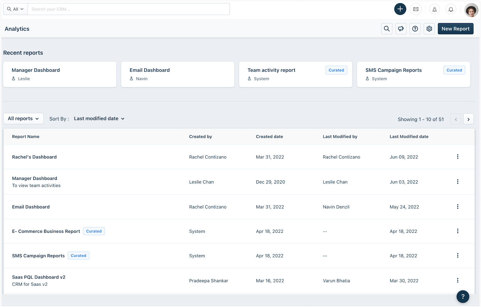 Para visualizar os relatórios que você compartilhou com outros usuários, alterne para a visualização "Relatórios de propriedade". Aqui, você pode visualizar a lista de relatórios junto com as datas em que as alterações foram feitas no relatório.