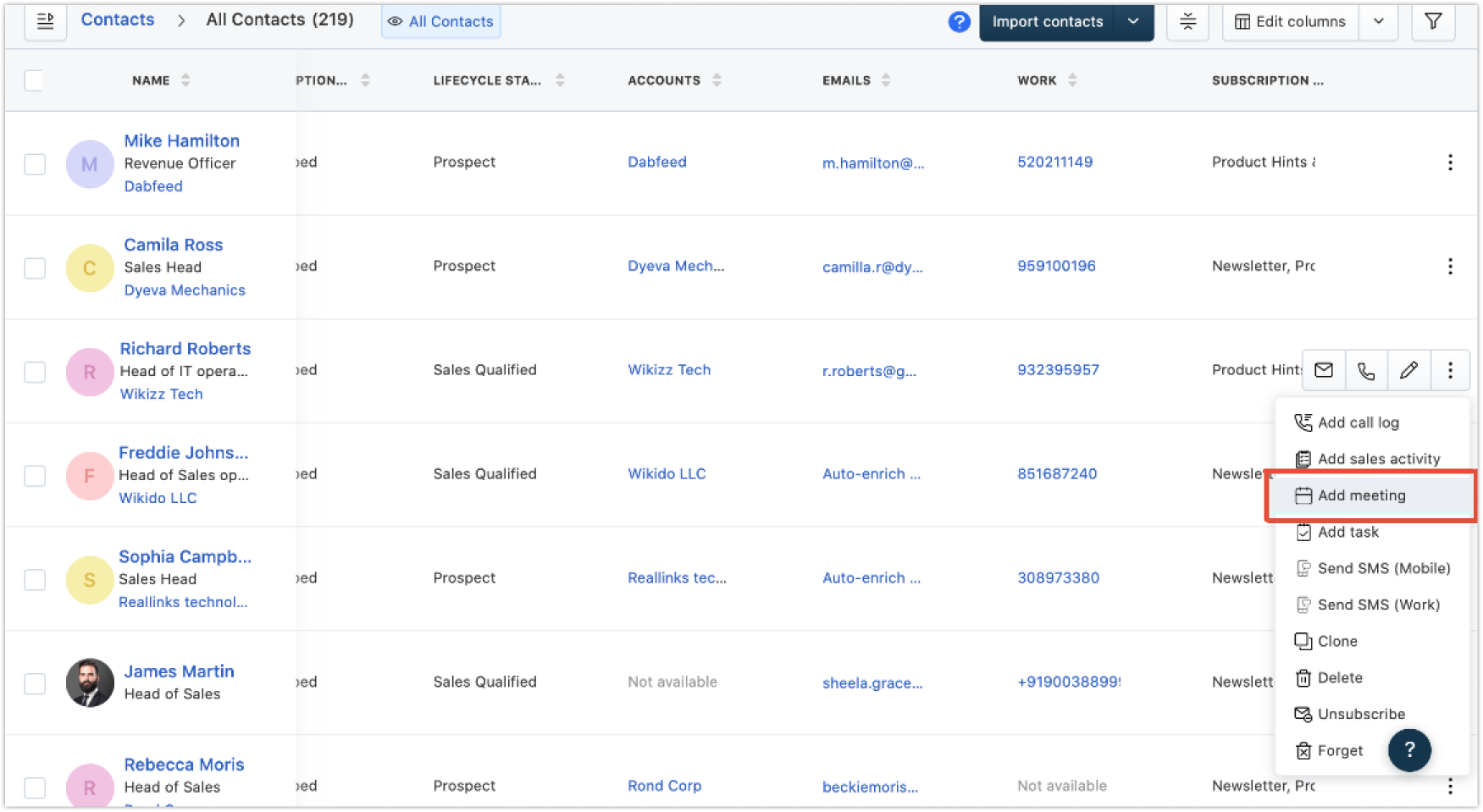 Na página de lista de um contato ou conta, clique no ícone de três pontos e selecione Adicionar reunião para adicionar uma reunião.