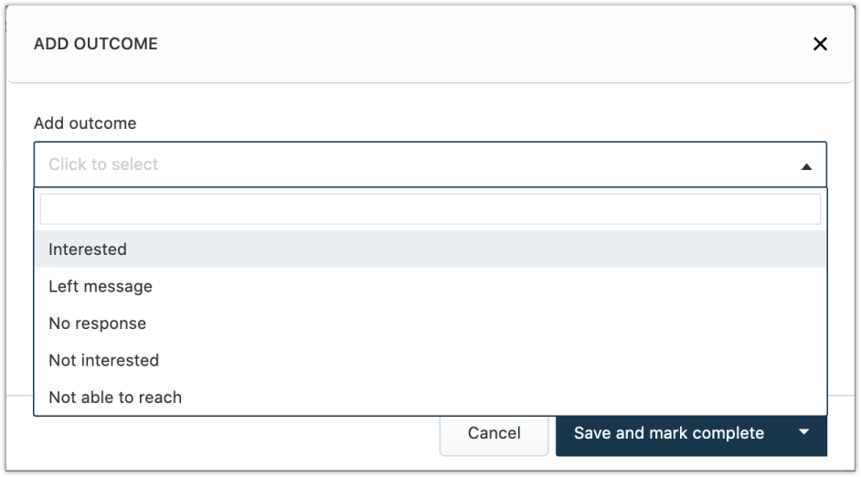 - Você também pode marcar uma tarefa como concluída na página inicial de um contato, conta ou negócio clicando no ícone Tarefas e, em seguida, clicando no botão Marcar como concluído .