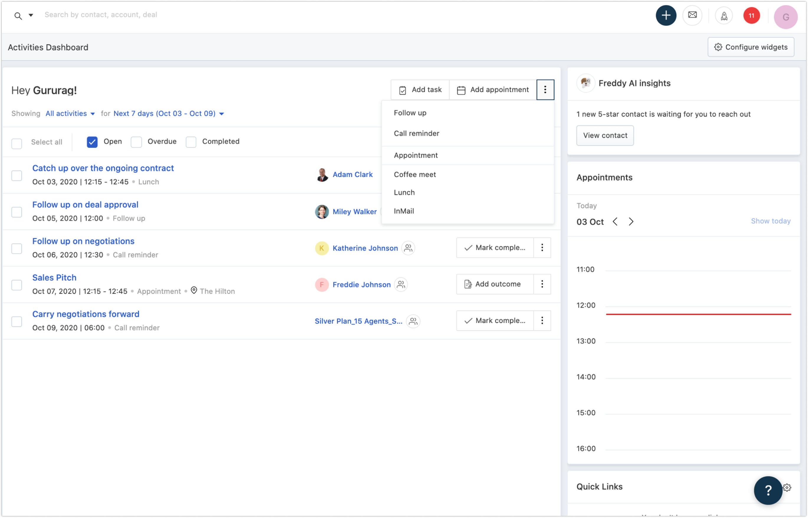 1. All completed activities related to a specific Contacts/Accounts/Deals is listed in their respective activity timeline. All upcoming activities can be viewed on the right panel. This listing can’t be edited or removed from the timeline. You can also view all upcoming activities on the Activities dashboard.
