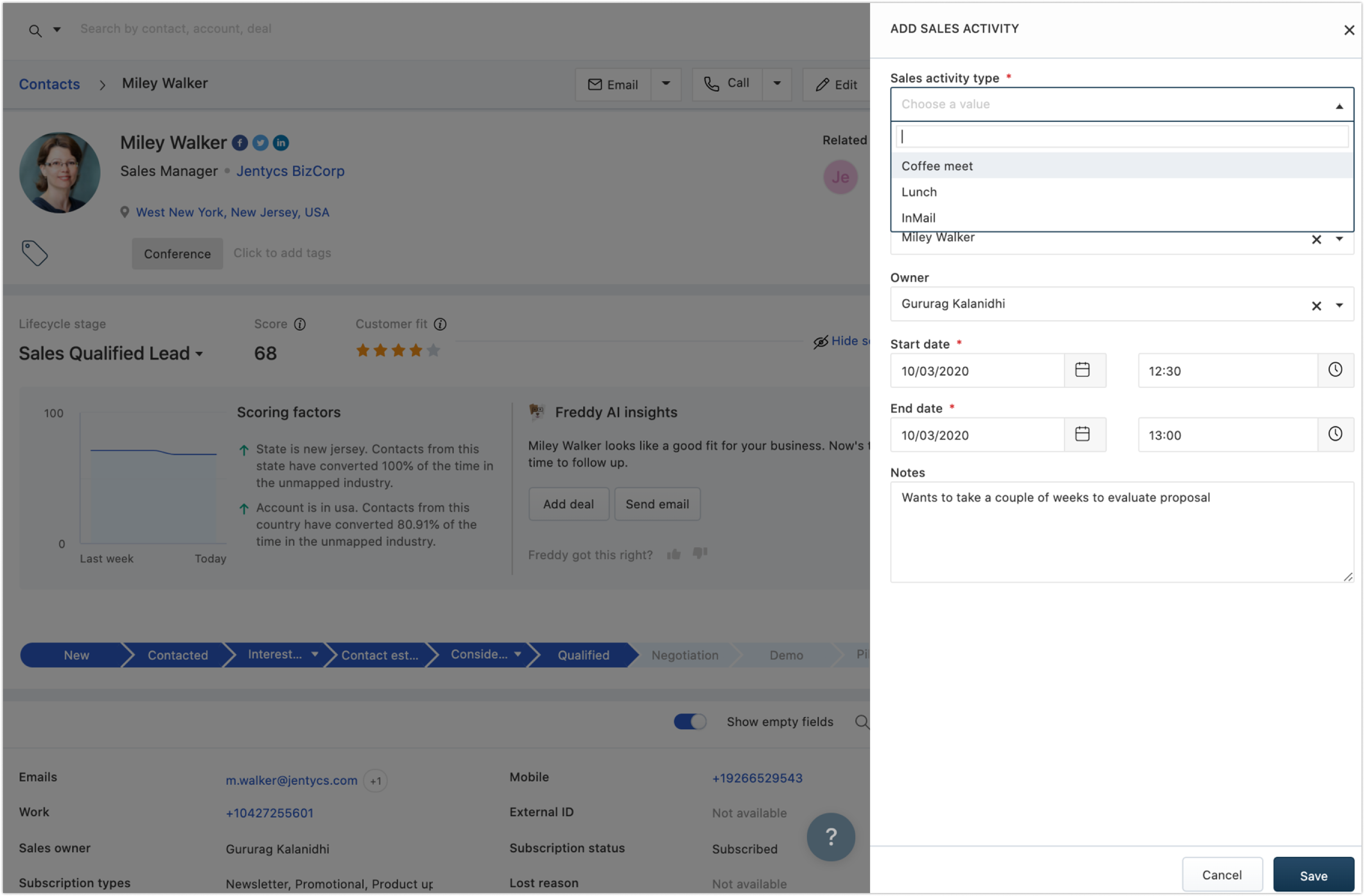 Keeping a record of these activities, it’s outcomes and some useful specifics that you get to know about the prospect from the meeting can be made note of with custom sales activities.