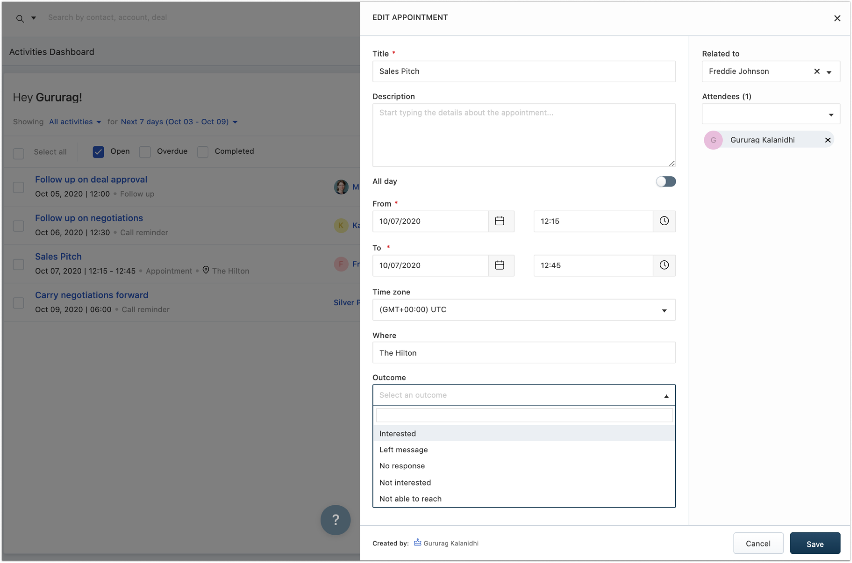 Fill out all the details relevant to your Sales activity and Choose the Outcome of your sales activity from the dropdown.