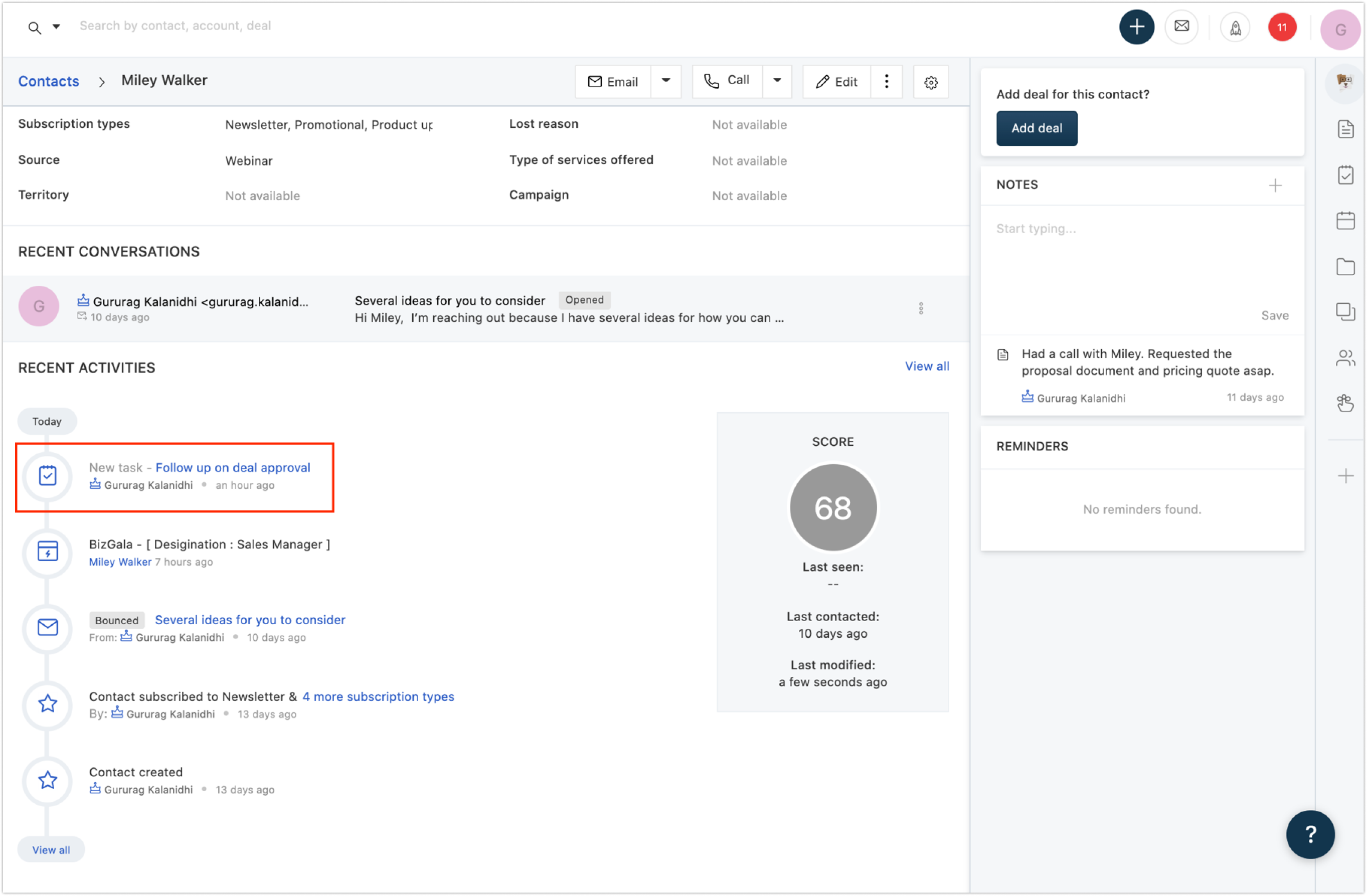 2. You may also see all your activities in the Recent conversations section of each record. You can see details like sales activity type, name of the activity, and Owner.