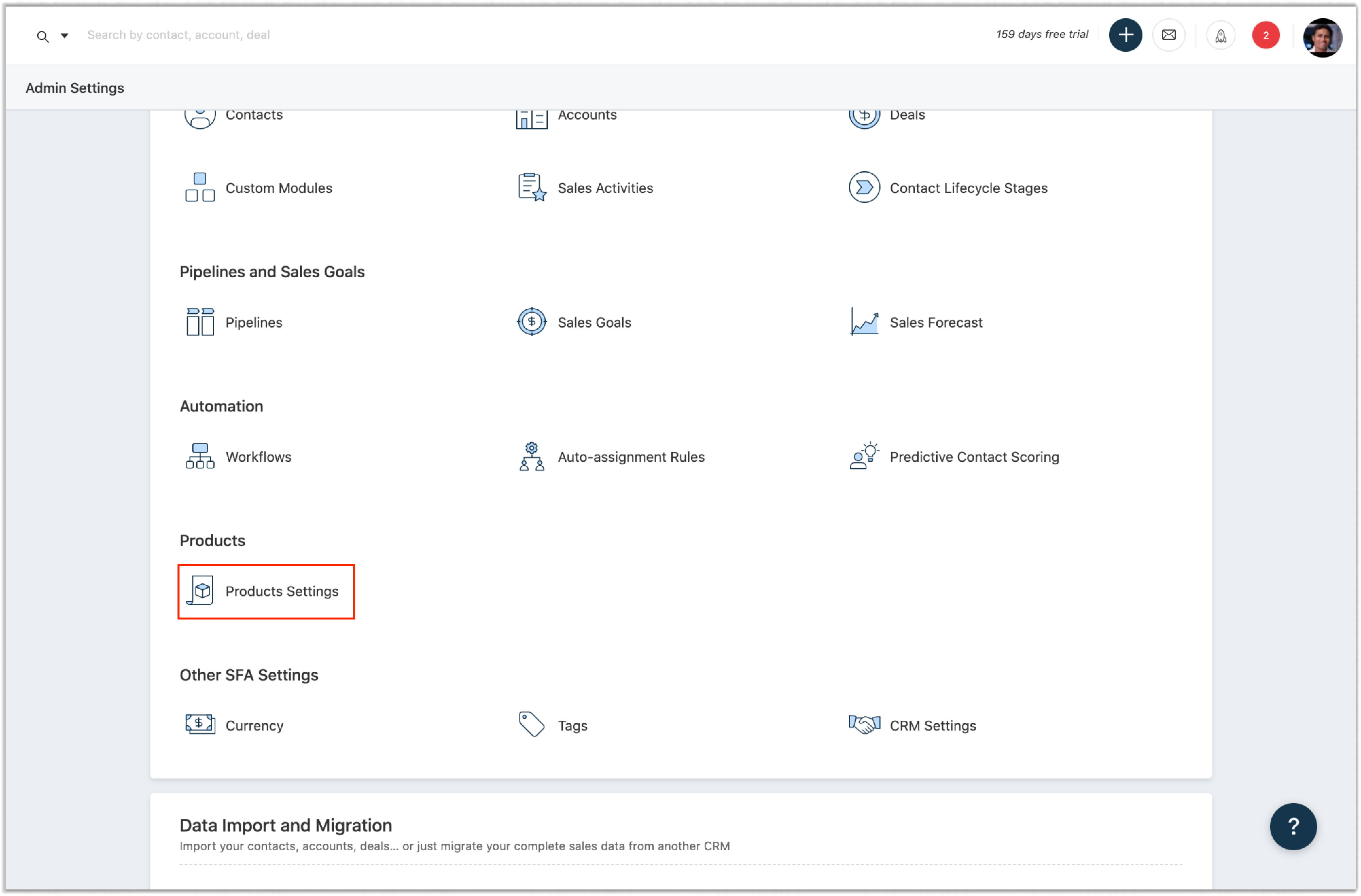 Nota: Por padrão, o módulo de produtos está desabilitado. Você precisa ter uma função de administrador para habilitar esse recurso.