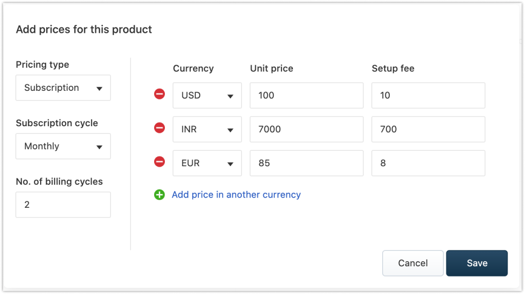 O preço de um produto pode ser adicionado em várias moedas, que são definidas no nível da conta pelo administrador. Clique aqui para saber mais sobre como adicionar várias moedas.