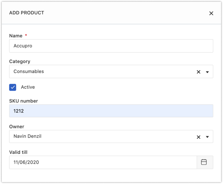 Vá para Configurações de administrador > Módulo de produtos. A seguir estão os campos padrão disponíveis no módulo de produtos.