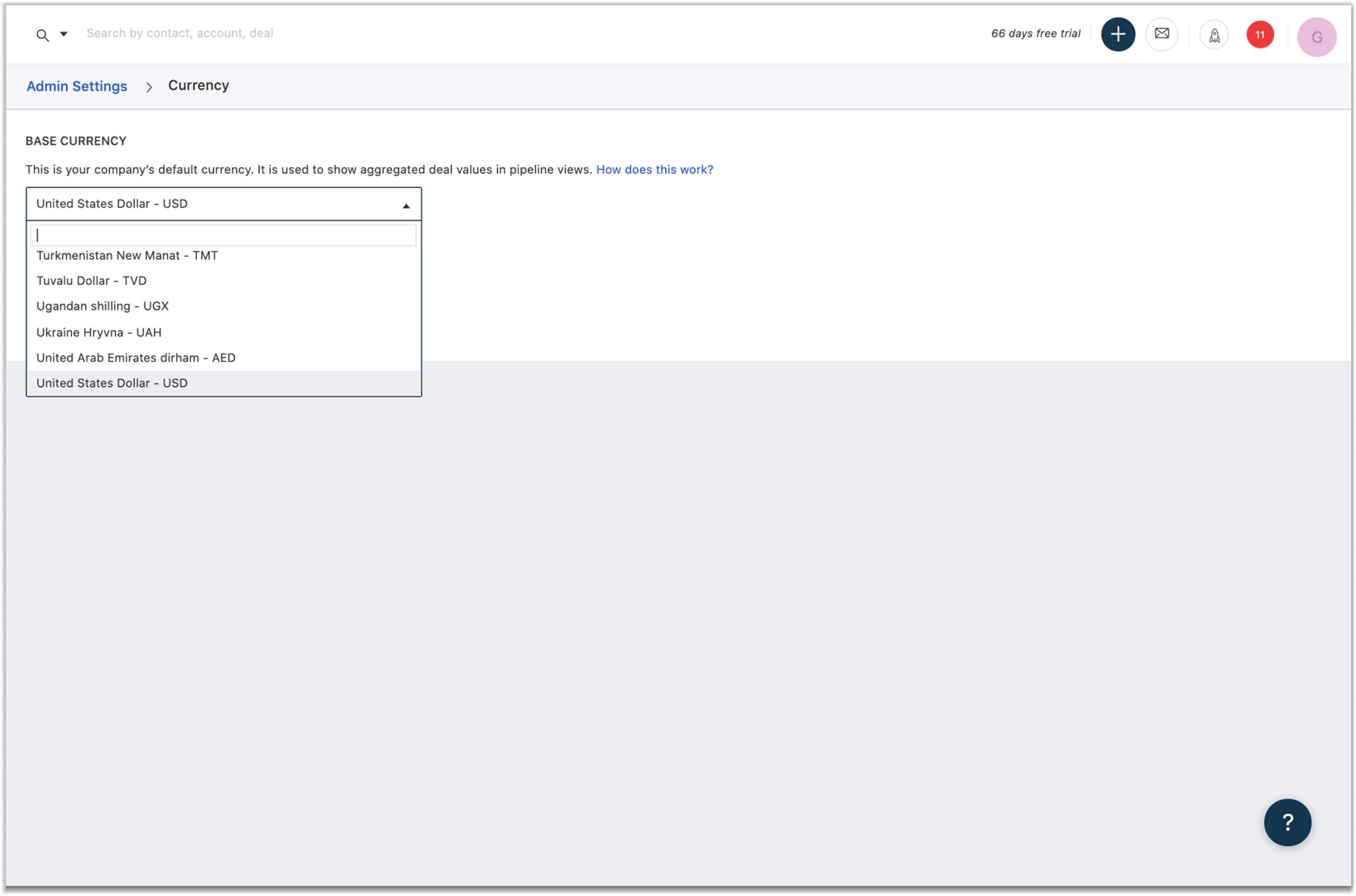 Adding more currencies: Once your base currency is set in place, you can proceed to add all the different currencies you want to create deals in.