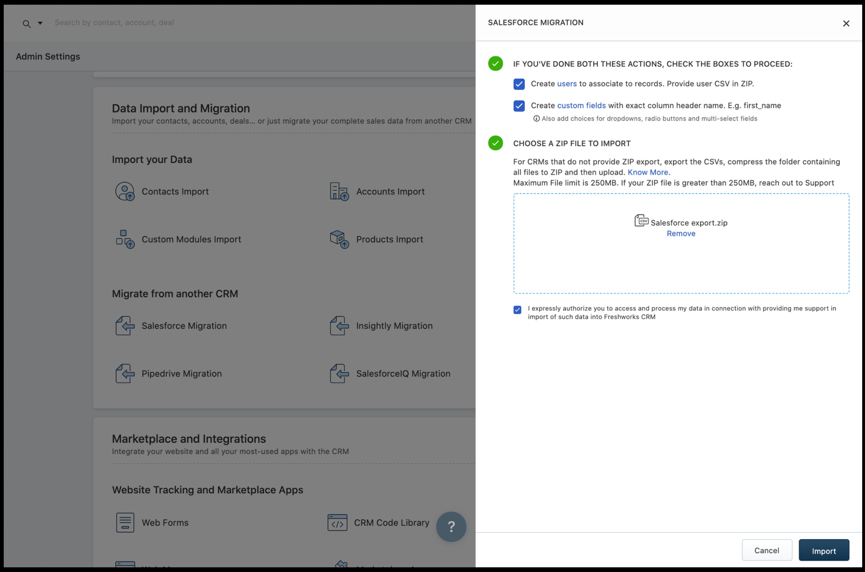 Vá para Configurações de administrador e role para baixo até Importação e migração de dados e selecione um dos CRMs na seção 'Migrar de outro CRM'. Você pode escolher entre Salesforce, SalesforceIQ, Pipedrive, Zoho CRM e Insightly. Isso abre a sobreposição de Migração.