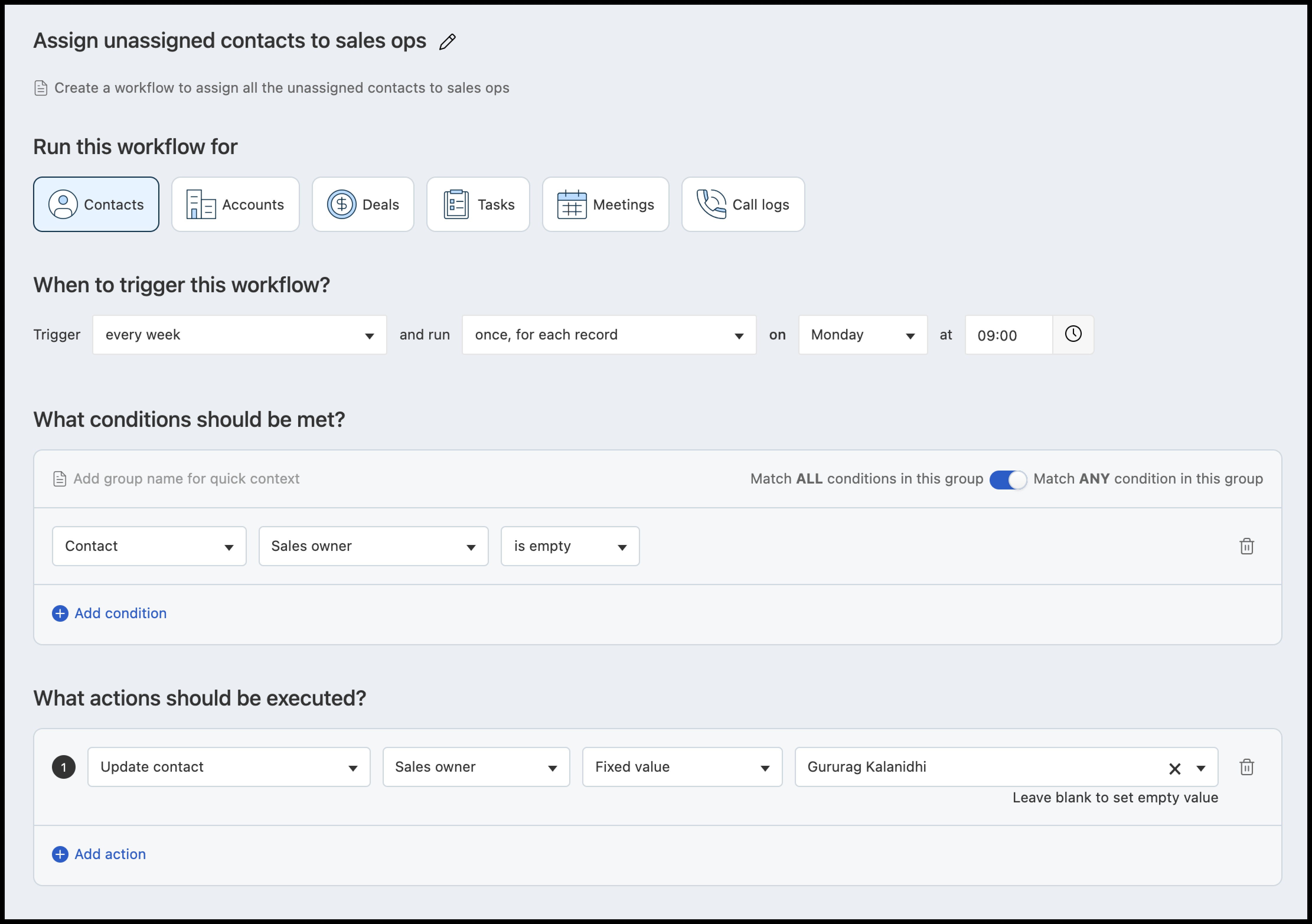 Quais ações devem ser executadas: Atualizar a propriedade do contato: Proprietário de vendas = Escolha o nome do usuário ou proprietário de vendas