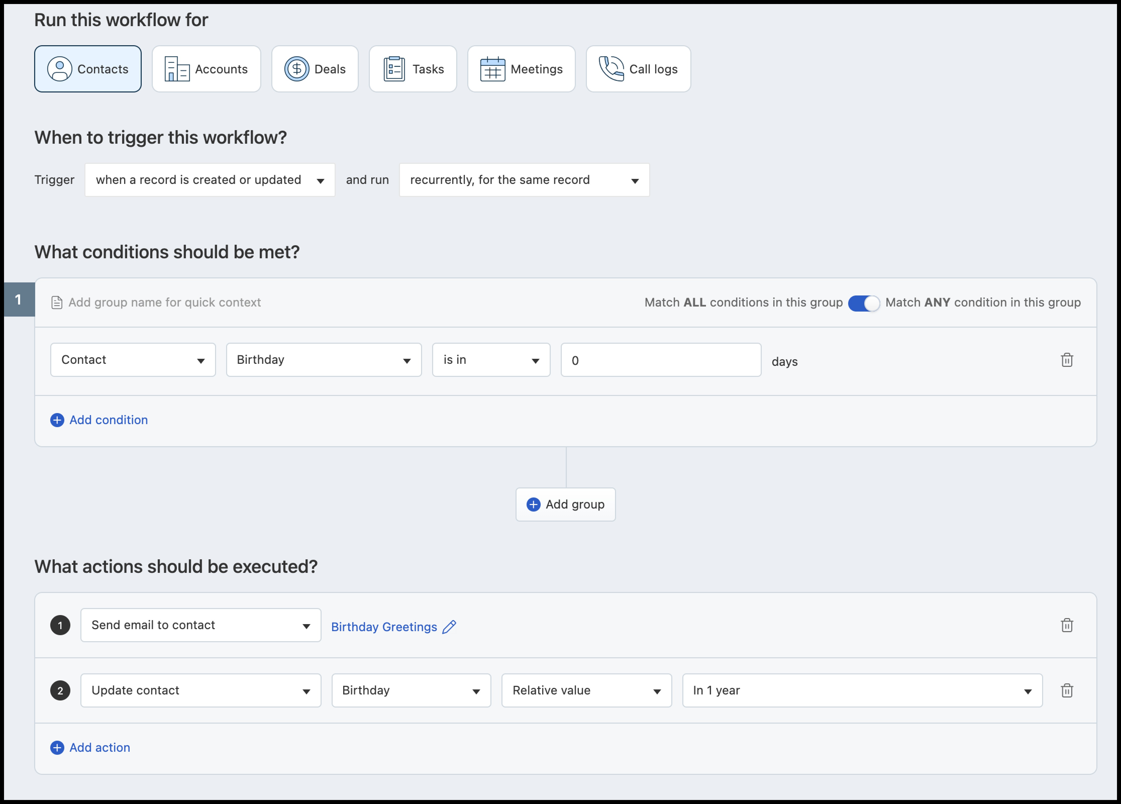 Se você deseja enviar saudações de aniversário para seus contatos, pode automatizar o mesmo usando fluxos de trabalho. Você pode criar um fluxo de trabalho que acione um email na data de aniversário do contato no ano atual e atualize a data para o próximo ano após o envio do email. Isso pode ser feito atualizando o campo de aniversário em 1 ano.