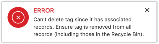 Nota: Tentar excluir uma tag sem remover sua associação com registros resultará em uma notificação de erro. Os registros na lixeira também precisarão ser desassociados das tags antes que uma tag possa ser excluída.