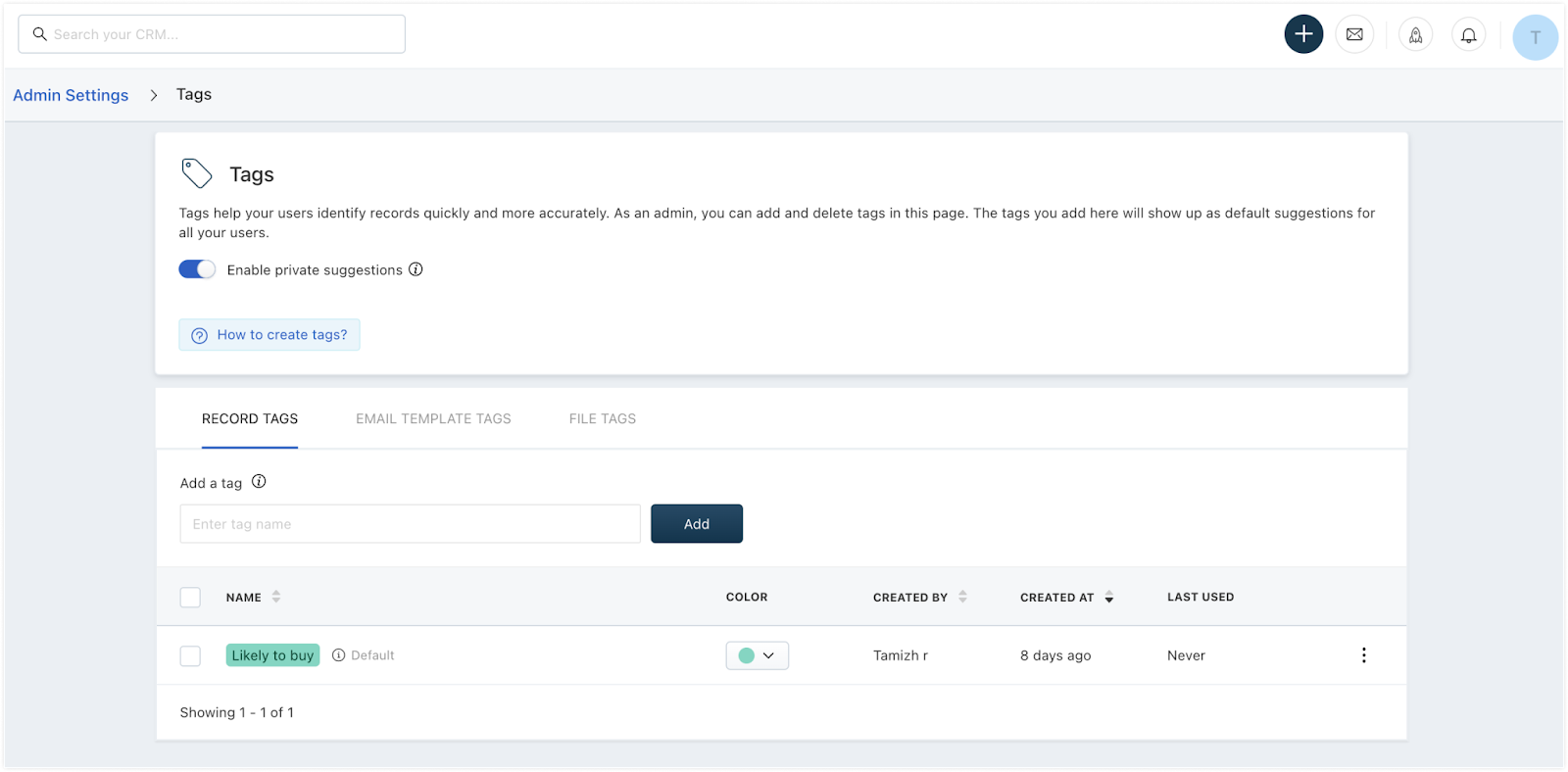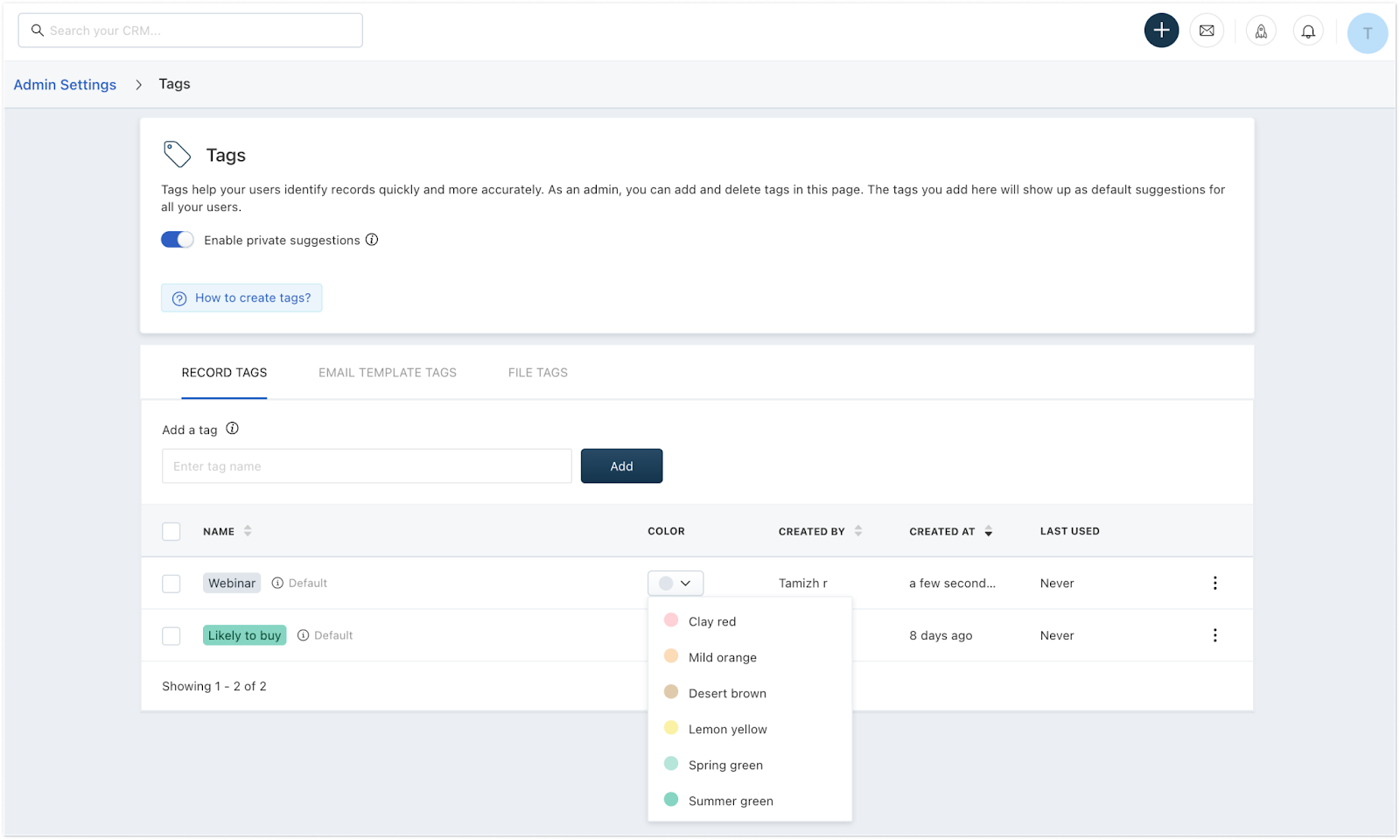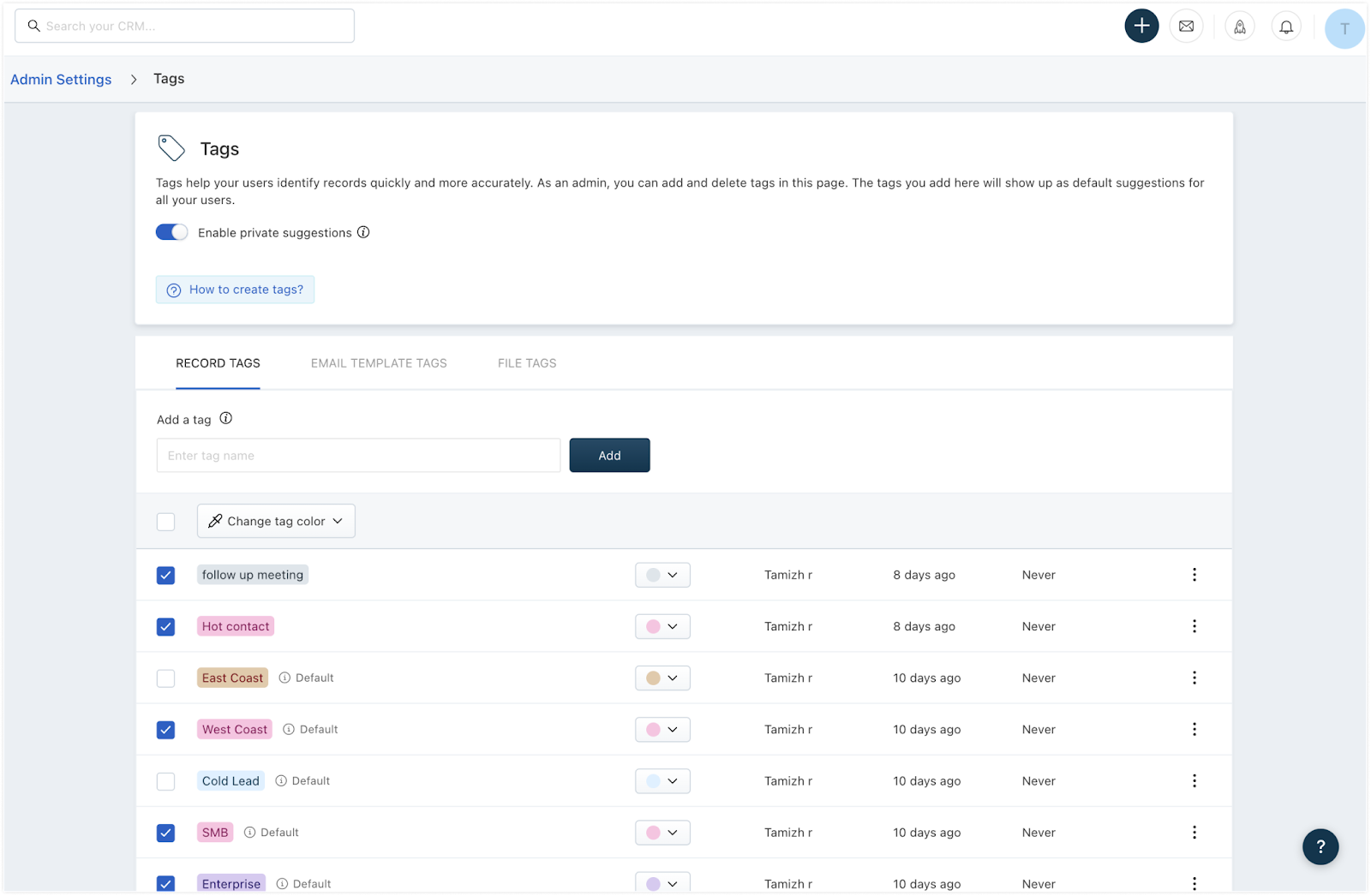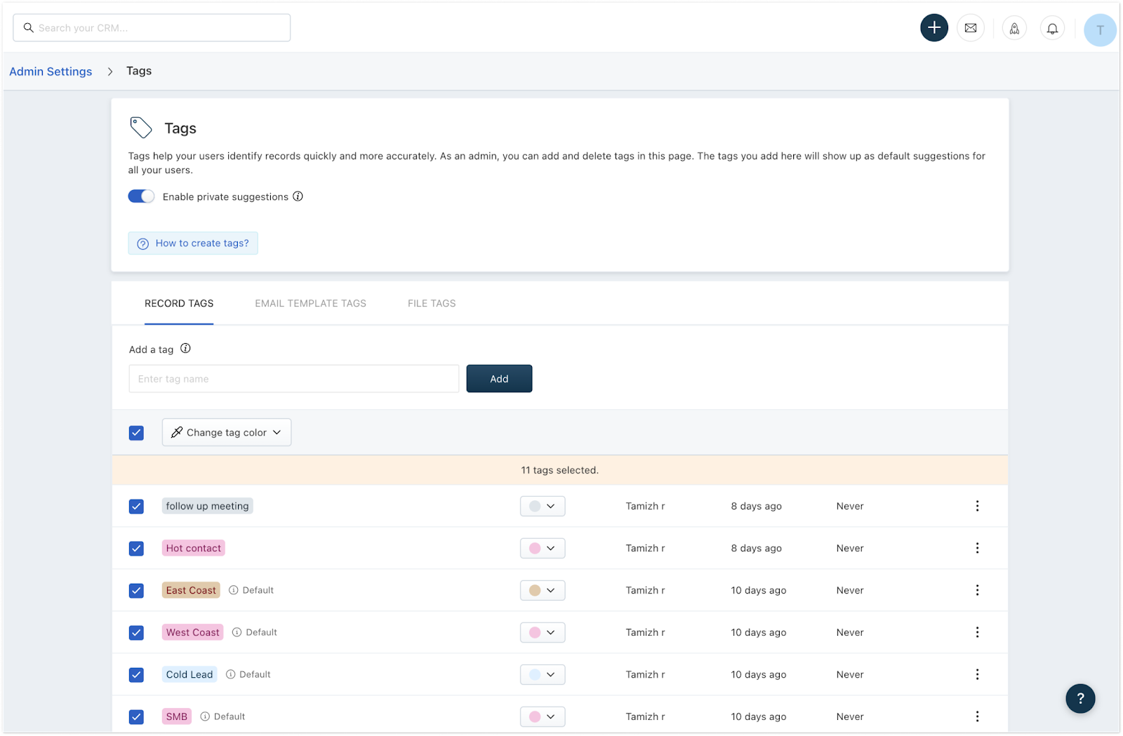 Por padrão, as tags criadas por qualquer usuário ficarão visíveis para todos os usuários no CRM. Para limitar a visibilidade das tags criadas pelos usuários apenas para eles mesmos, ative a opção 'Ativar sugestões privadas'. Isso garante que os usuários não visualizem tags criadas por outras pessoas como parte de suas sugestões de tags. Por exemplo, uma tag chamada 'Líder de webinar' criada pelo usuário A não ficará visível para o usuário B se a opção 'Habilitar sugestões privadas' estiver habilitada.