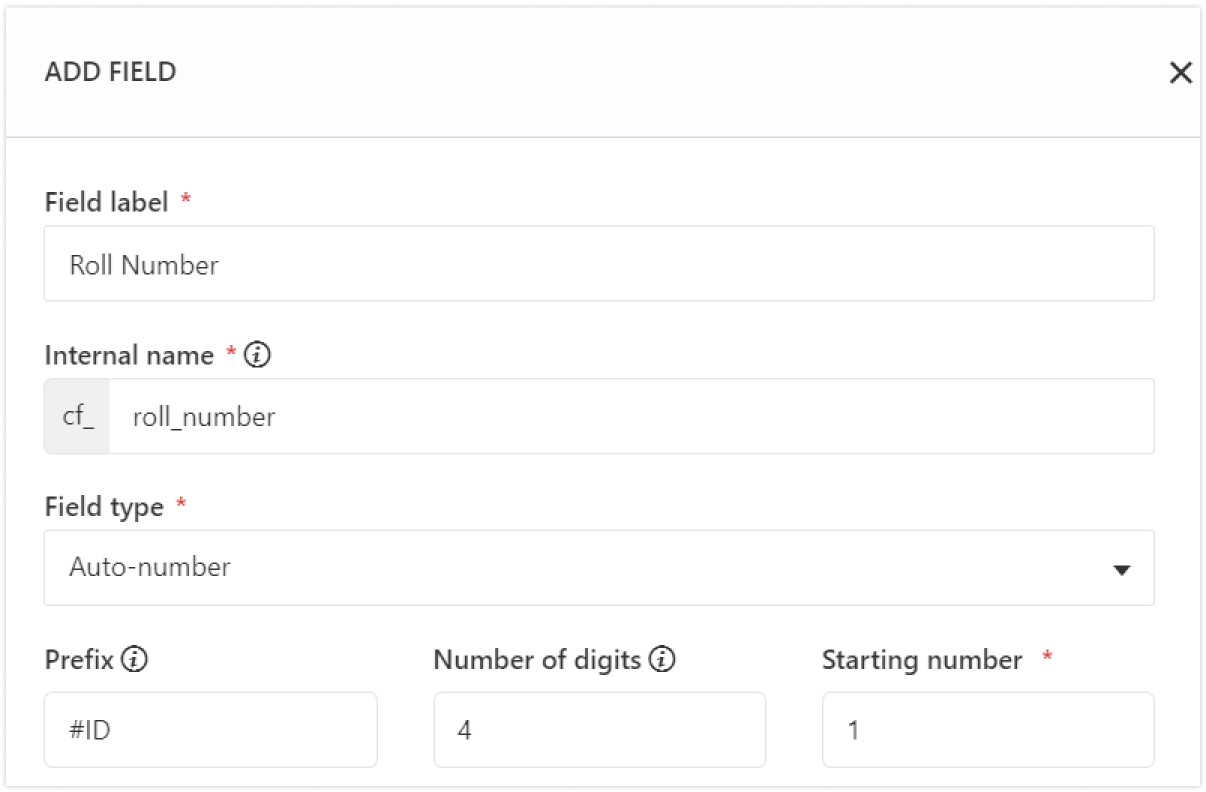 Número Inicial - Valor a partir do qual os números seriam atribuídos a cada registro. Por exemplo, se o número inicial for 100, o registro recém-criado receberá o número 100. Por padrão, o número inicial é 1.