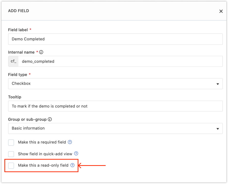 Marque um campo como somente leitura para garantir que ele esteja acessível, mas não possa ser editado ou adulterado inadvertidamente. Você pode definir o campo somente leitura ao adicionar um novo campo (campos personalizados) ou editar um campo existente (campos padrão e personalizados).