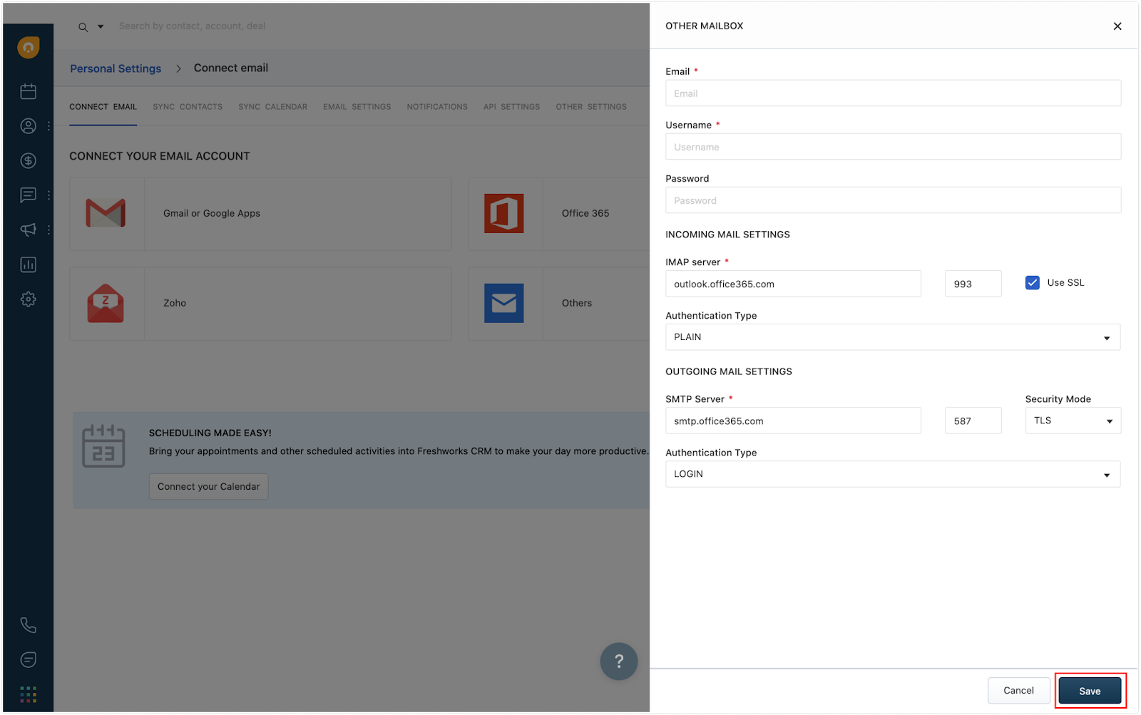 Esse recurso pode ser usado com serviços (como Gmail, Office365 etc.) ou servidores SMTP e IMAP privados. Você terá que garantir que as configurações sejam definidas corretamente para garantir que o sistema seja à prova de falhas. Você também pode optar entre habilitar seu servidor de e-mail para e-mails recebidos e enviados ou apenas para e-mails enviados.