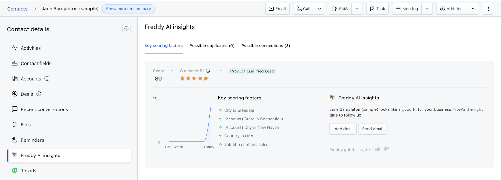 Clique no hiperlink “Mostrar os principais fatores de pontuação” na seção de visão geral do contato para visualizar os detalhes na guia Freddy AI insights.