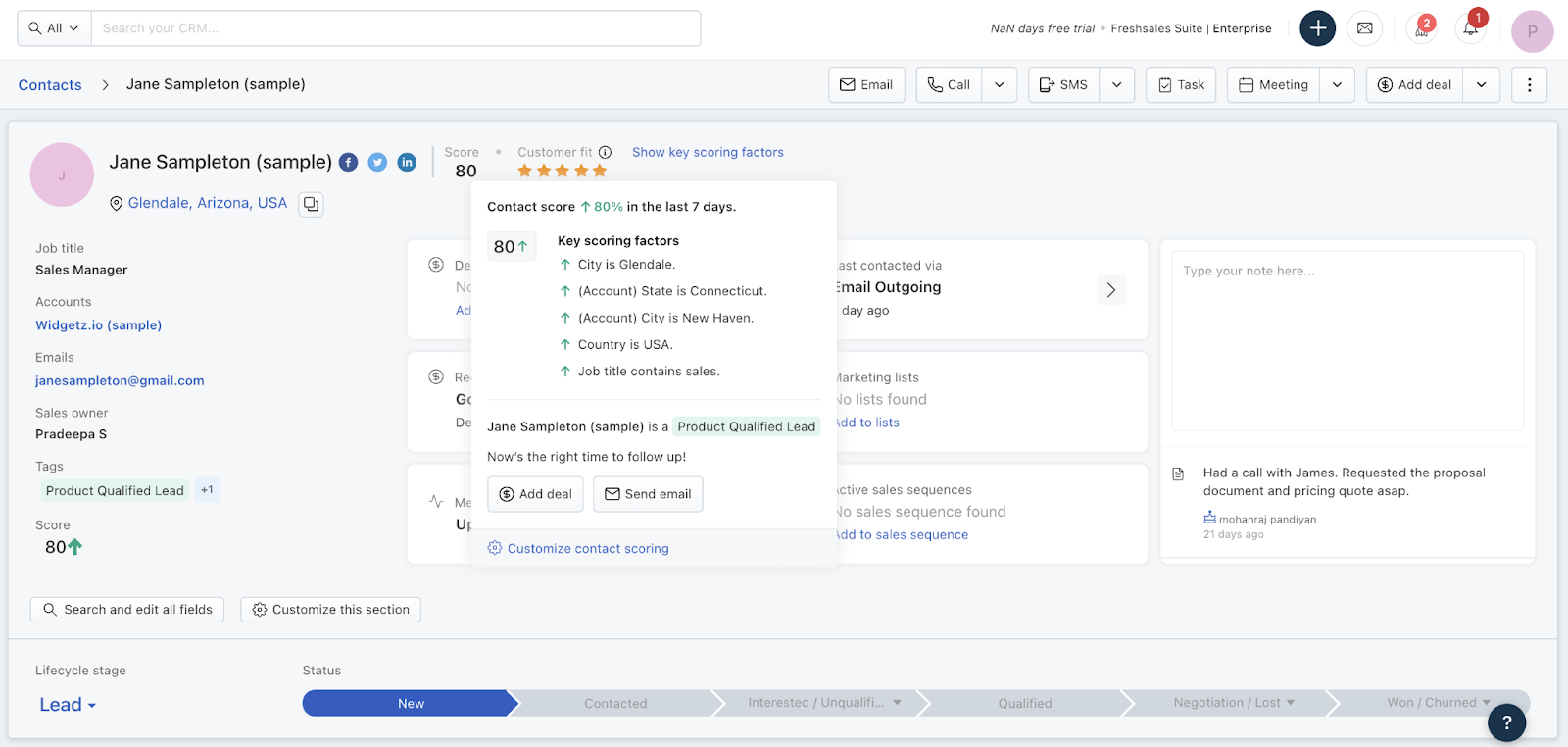 - Classificação de adequação do cliente: a classificação de adequação do cliente é uma representação de quão perto o contato está da conversão - uma classificação de quatro ou cinco estrelas ajudará você a saber instantaneamente se o contato está pronto para vendas.