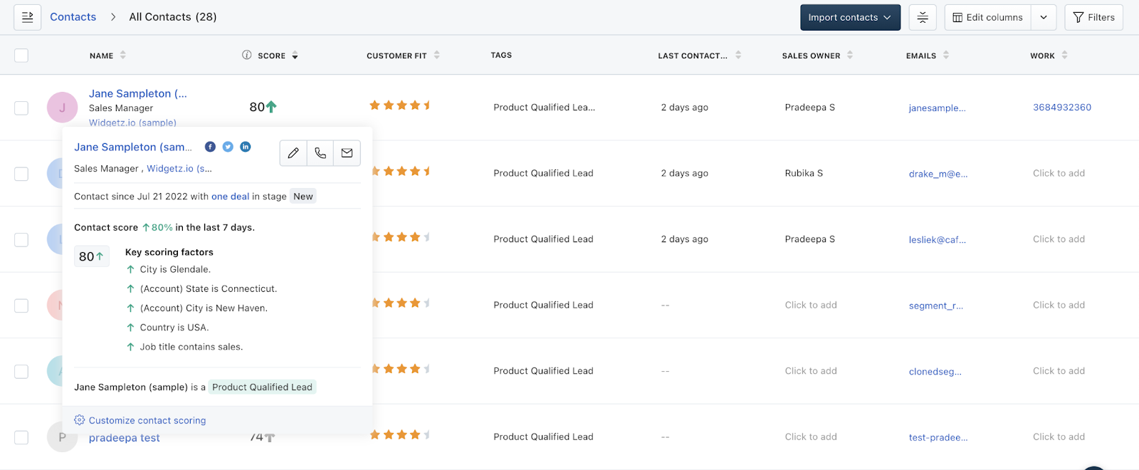 Os contatos que se envolveram com seu produto mais recentemente são os mais interessados em seu produto. Na página de exibição da lista de contatos, há duas colunas que descrevem como o contato está se saindo - as colunas pontuação e ajuste do cliente.