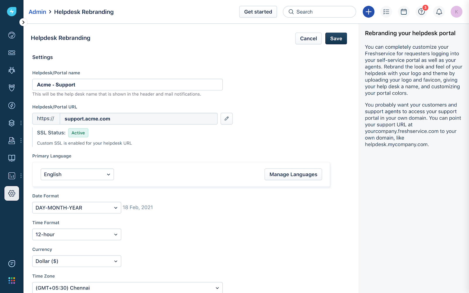 O Freshservice oferece um SSL curinga padrão para todos os usuários que possuem um portal de suporte em um domínio freshservice.com. Isso pode ser usado desde que você continue a usar o URL padrão do Freshservice com o qual se inscreveu (por exemplo: suaempresa.freshservice.com). No entanto, o padrão SSL não funciona quando você aponta um nome de domínio personalizado para o portal de suporte técnico (por exemplo: helpdesk.suaempresa.com).