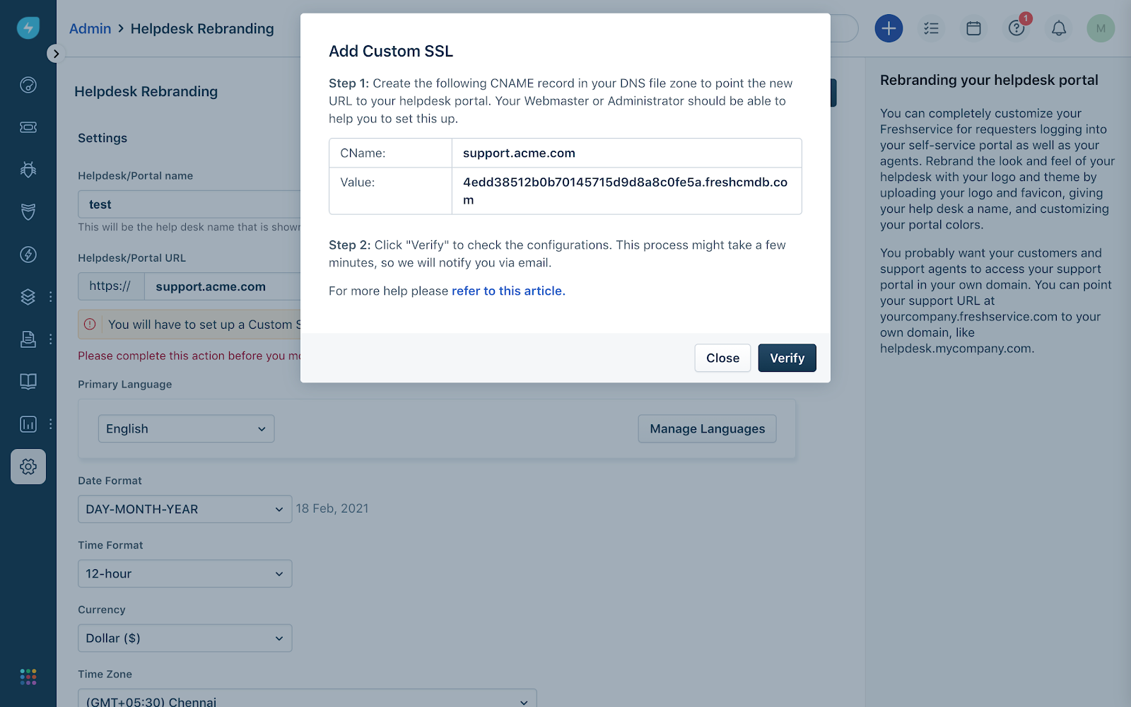 Depois que o CNAME for criado, clique em Verificar para concluir a configuração no final do Freshservice