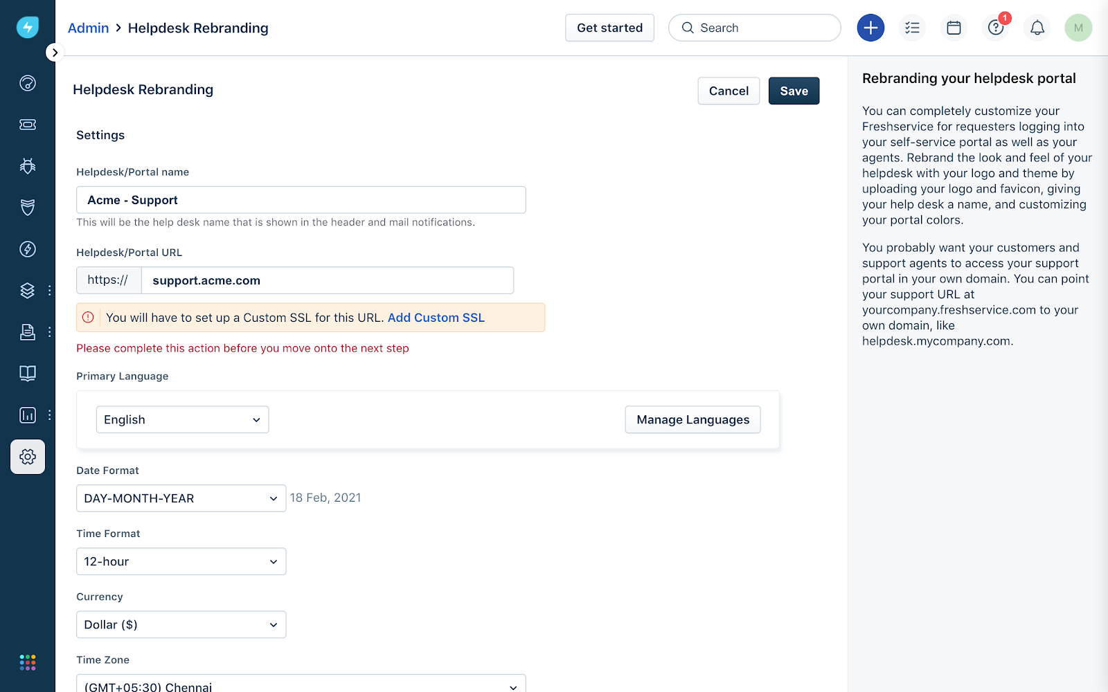 Nesse caso, você deverá configurar um certificado SSL personalizado fornecido pelo Freshservice com seu nome de domínio. Para isso, você precisará acessar o painel de controle do seu domínio para adicionar um registro DNS ao seu domínio personalizado.