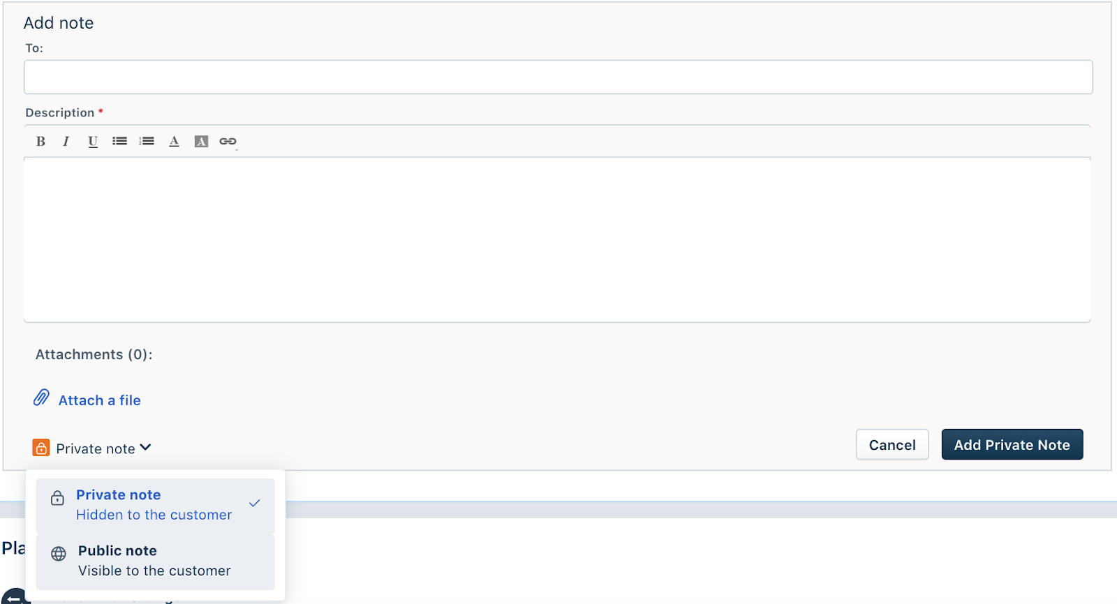 Depois que o agente recebe uma solicitação de alteração, ele pode navegar para Notas -> Adicionar novo e clicar em Nota pública/Nota privada na parte inferior e escolher se a nota precisa ficar visível ou oculta para o solicitante.