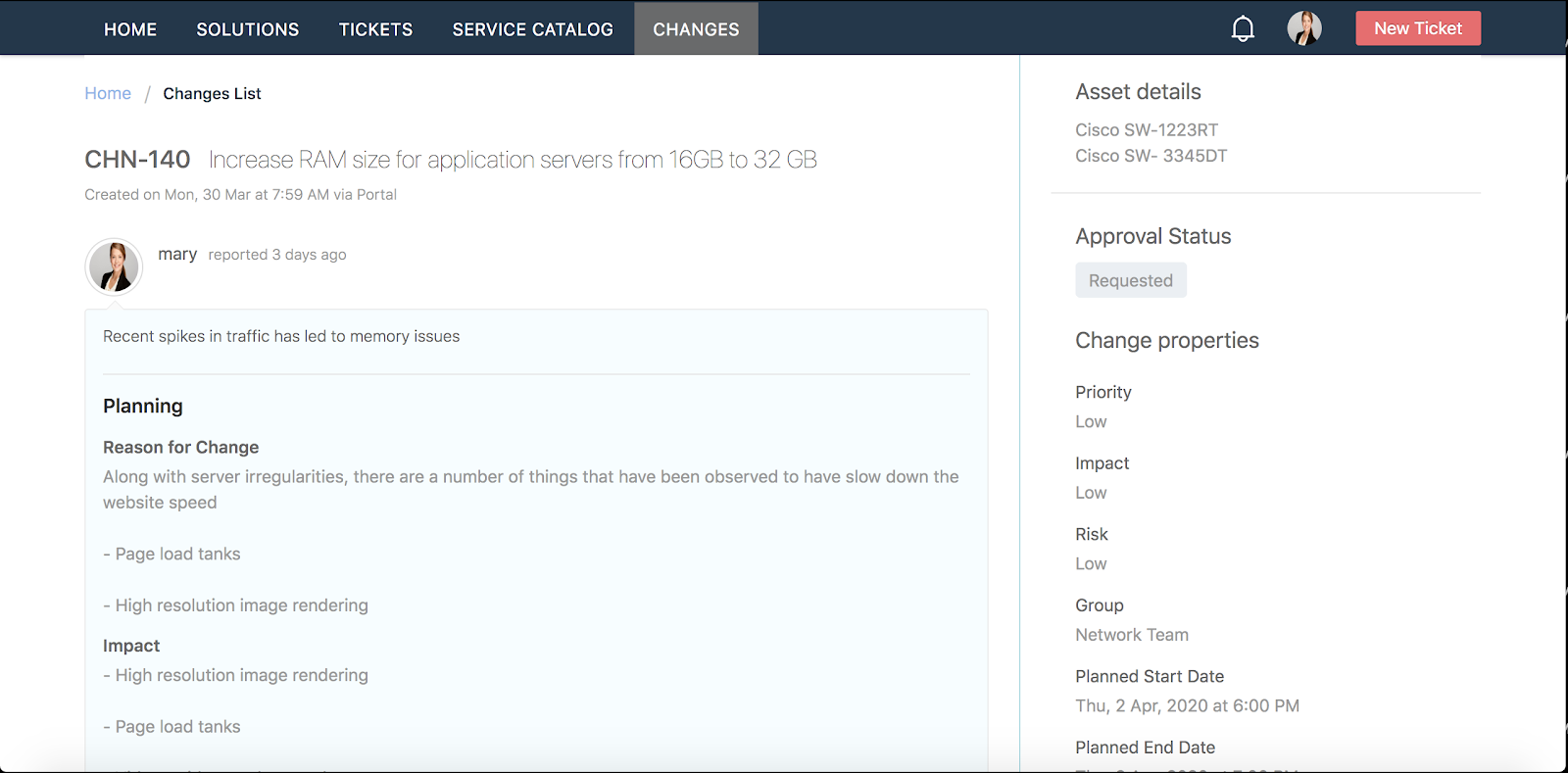Com o Freshservice, os usuários corporativos agora podem fazer uma solicitação de alteração no portal, responder à solicitação, rastrear e ser notificado sempre que uma ação for executada na violação.