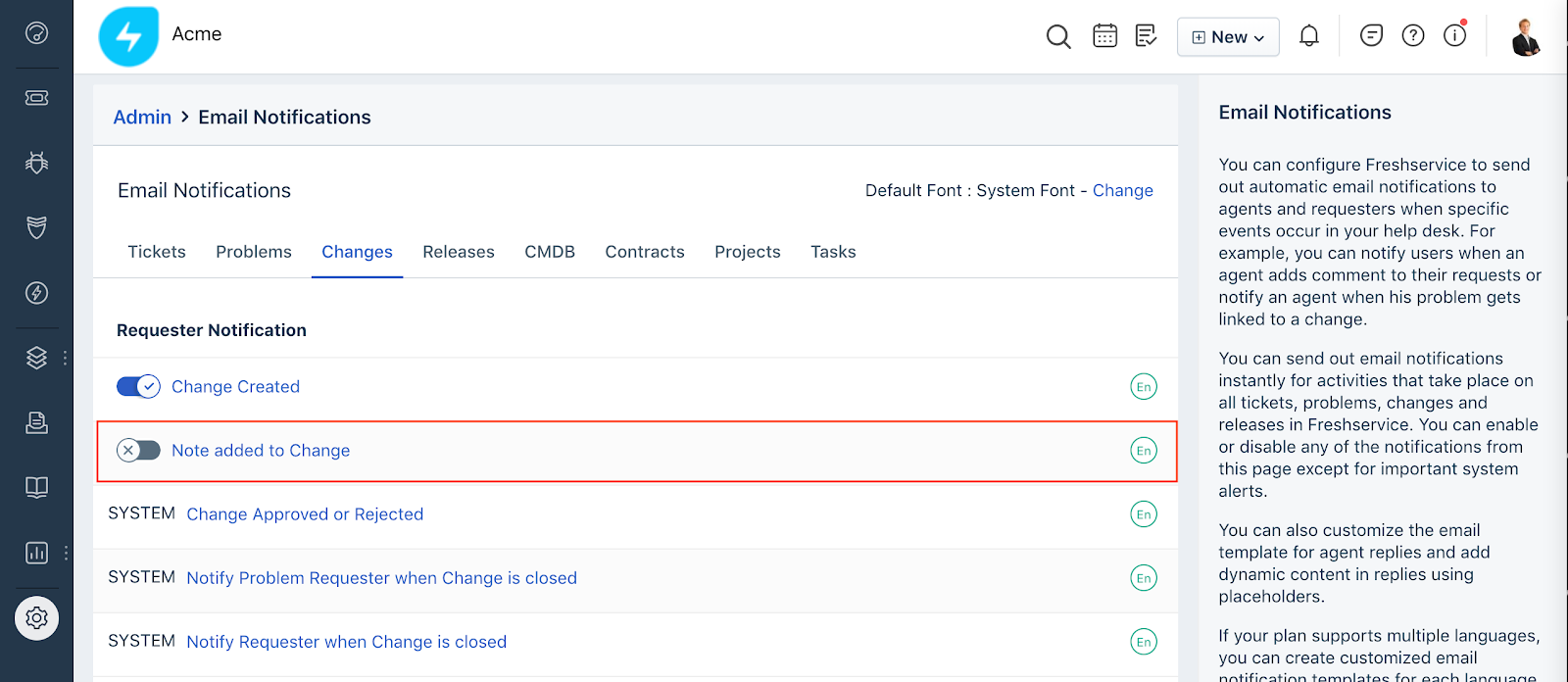 Da mesma forma, você também pode notificar o solicitante quando uma nota é adicionada à alteração ativando a Nota adicionada à notificação de e-mail de alteração em Admin -> Notificações por e-mail (em configurações da conta) -> alterações
