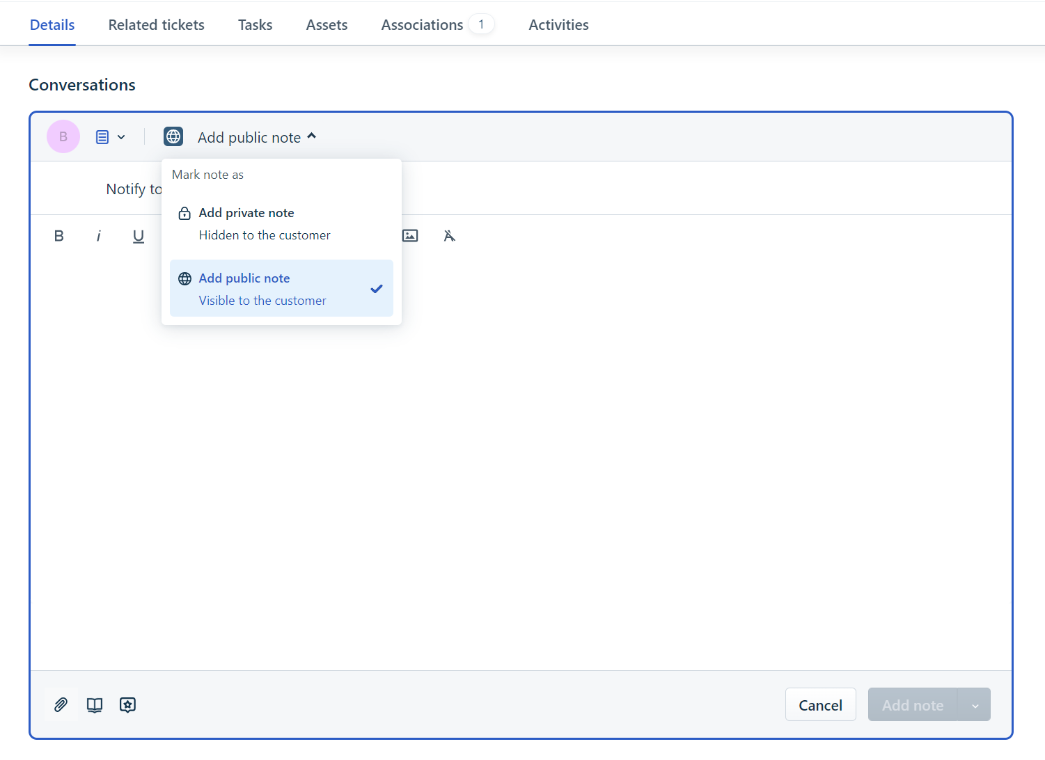 Selecione Adicionar nota pública na opção suspensa e comece a adicionar um comentário ao ticket